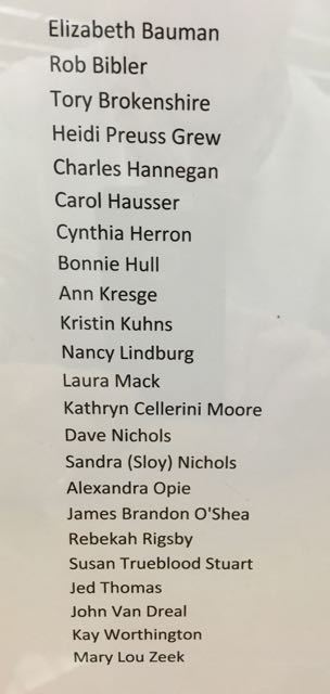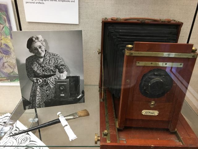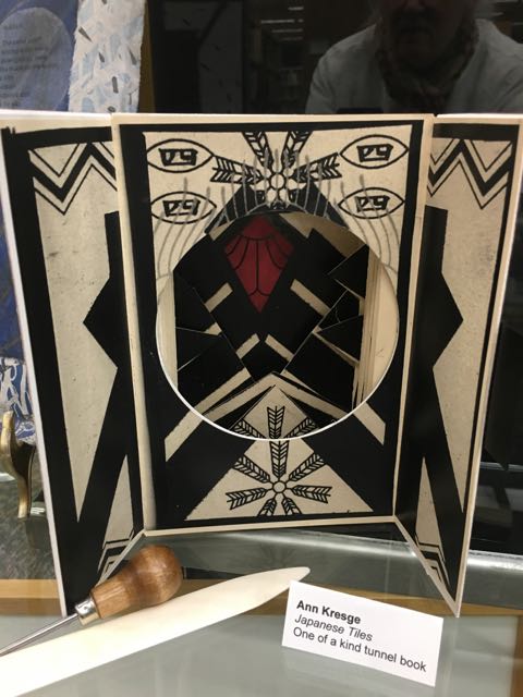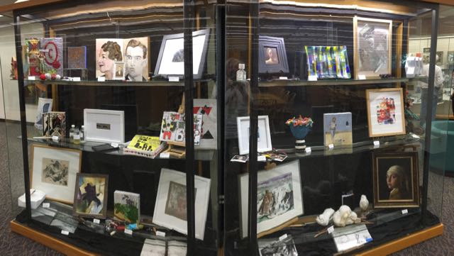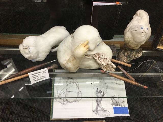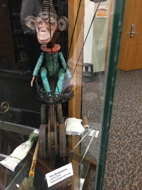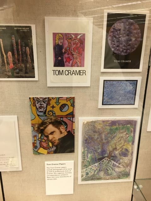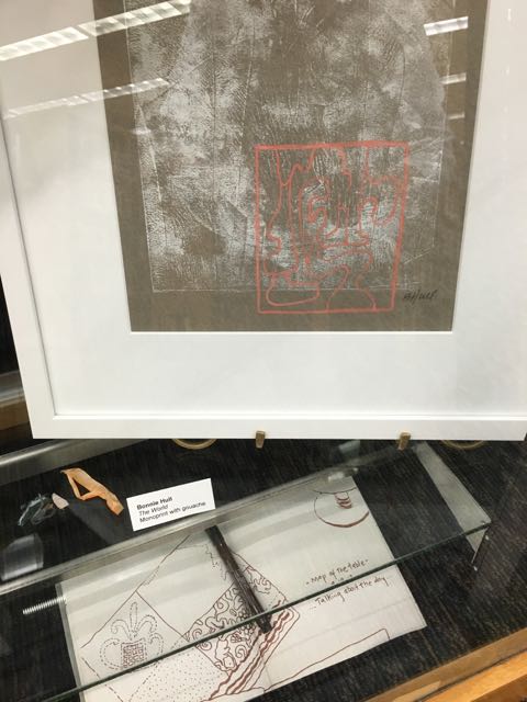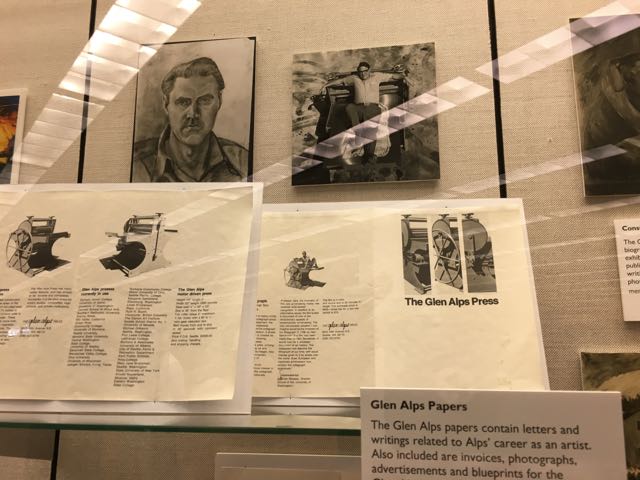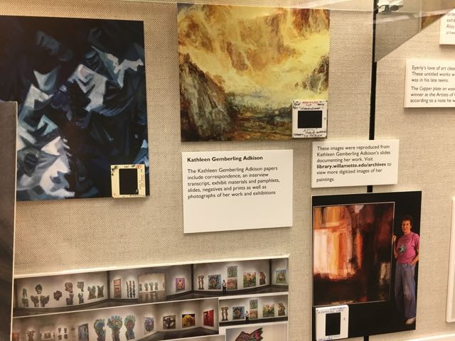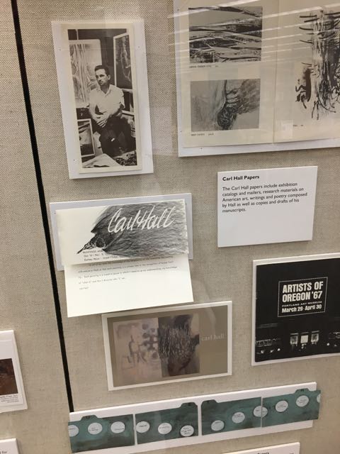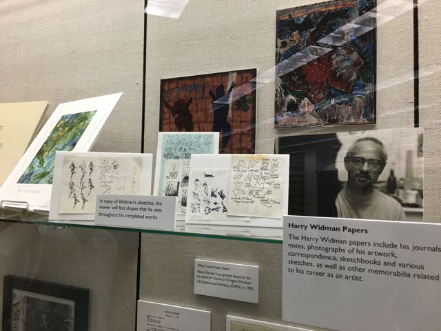 For the past ten years the collection has been building and now includes the papers of Rick Bartow, Tom Cramer, Jack Eyerly, Carl Hall, Henk Pander, Eunice Parsons, Harry Widman, Jan Zach and many many others.  There are drawing books, letters, show cards, photos, small art works and the PNAA has put together a fascinating exhibit of a smattering of items from the archive.  This show, curated by librarian Shanel Parette, is on the second floor of the library and will be there for two years…please DO come look and if you come before the end of October you’ll also have a chance to see the work of some Salem artists in an elegant small exhibit, “Insight and Imagination” curated by artist and former librarian Dayna Davidson Collins.  Below are Roger Hull and Mardy Widman looking at the Salem show with the PNAA show in the background.