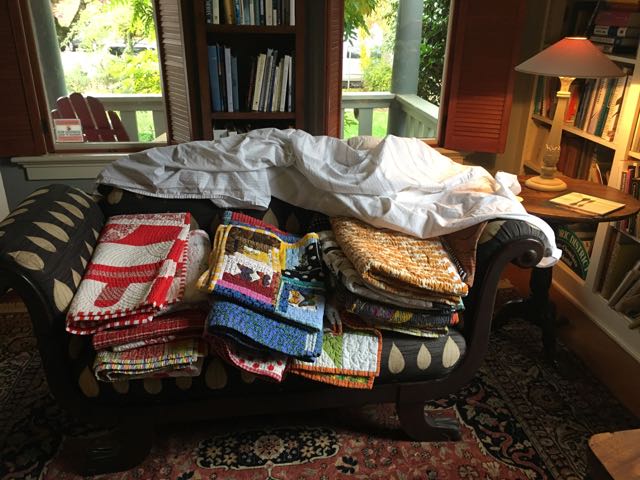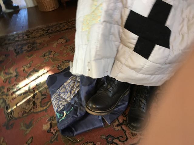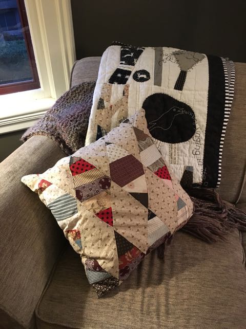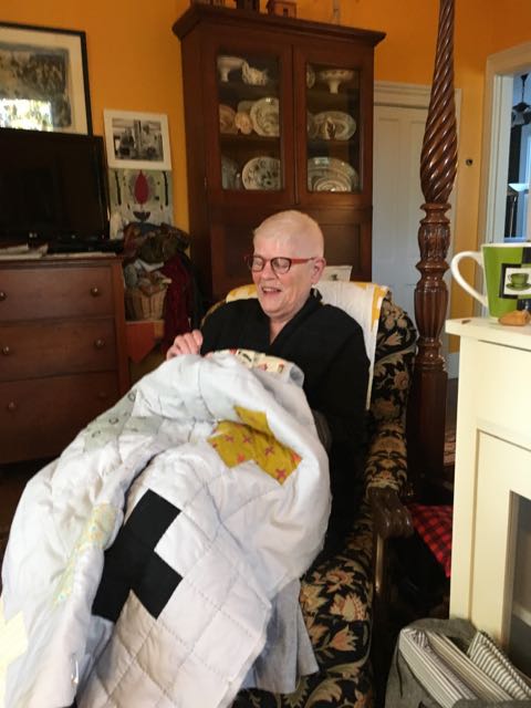 and was asked to stand up on my new knee. It hurt. The next day I was asked to walk down the hall and back and that REALLY hurt. I kept on sewing though and finished two place mats…in spite of the ill-placed IV…while R edited the index for the Bunce book…