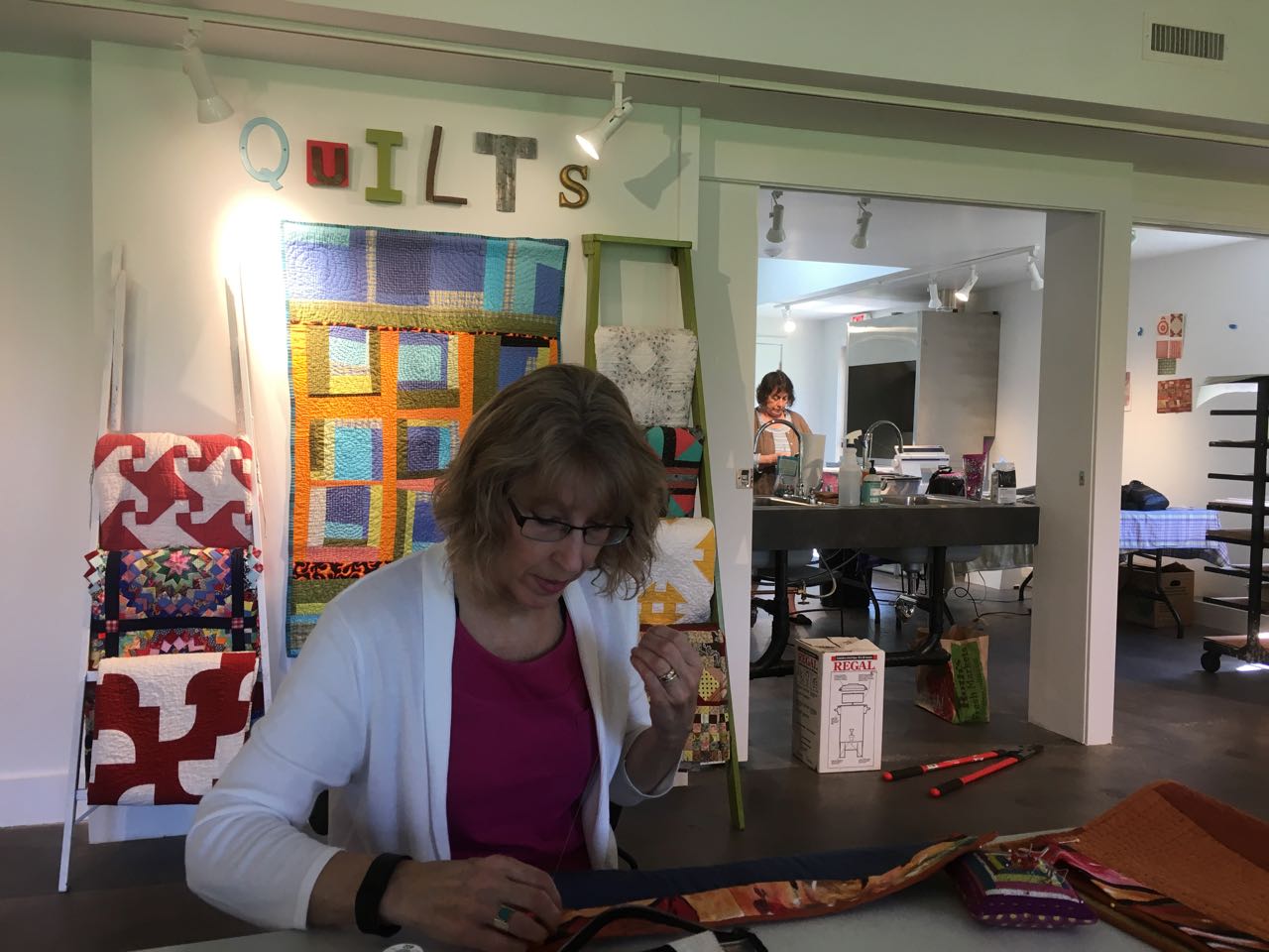 Because Kathleen has never shown her quilts before formally, none of them had hanging sleeves on the back so we called in the reinforcements..Eve, Diane, Kathleen and I sewed for HOURS! and then there was “burying the threads”…yikes!
