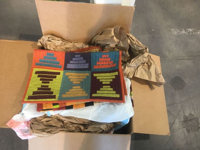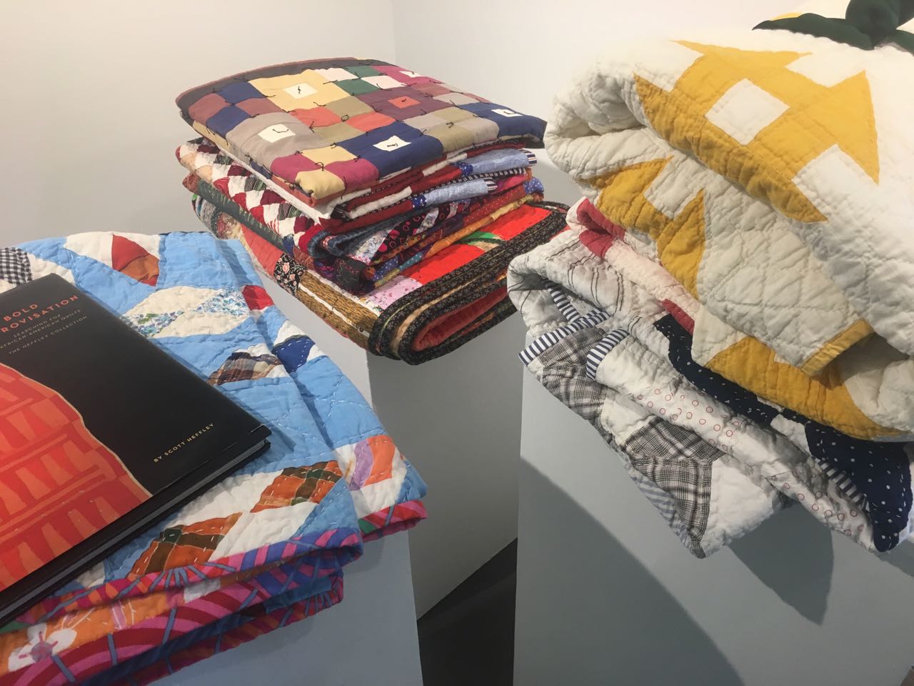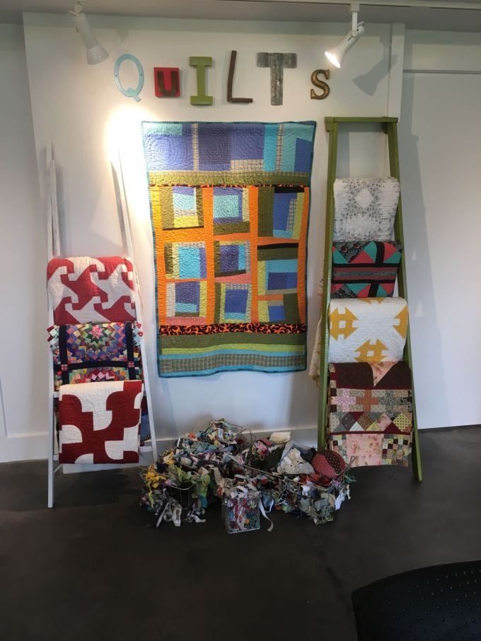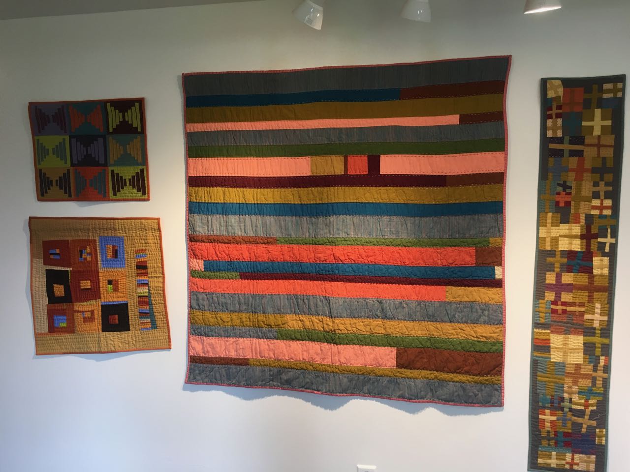 The work for this show includes some of her own work, some from local quilter Kathleen Leonard, some of mine and some from the Seattle quilter Nifty Quilts. It’s always a little daunting to face an empty room and a pile of stuff and try to make something out of it, but we managed…here’s the three from Nifty…