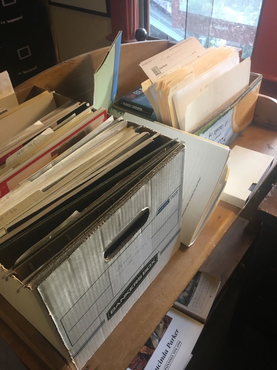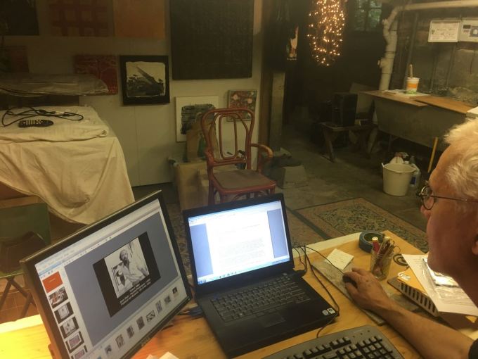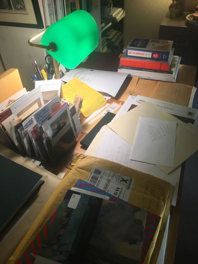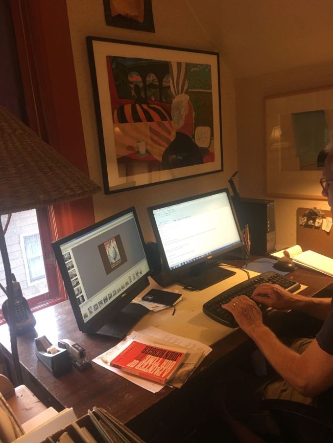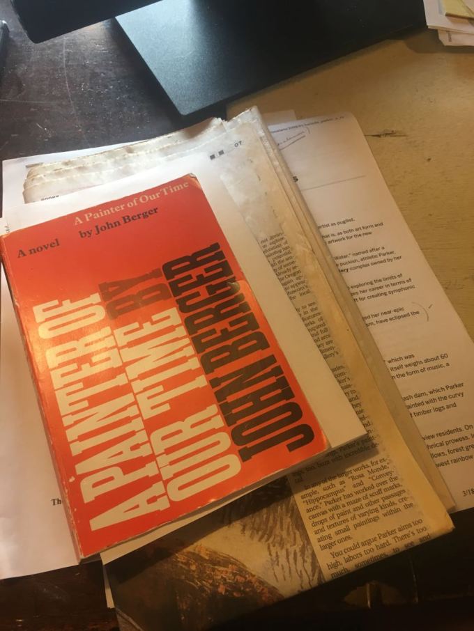 Roger Hull is currently writing about Portland painter Lucinda Parker to go along with an exhibition at the Hallie Ford Museum of Art in the winter of 2019 (January through March). But here in the summer of 2017 the work is well underway. Usually he writes upstairs…amid files and ephemera and work made by former students of yore….