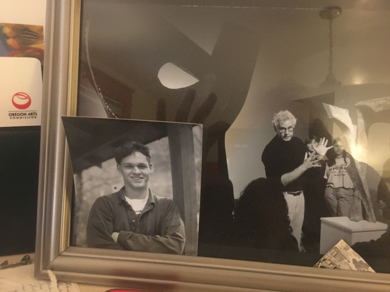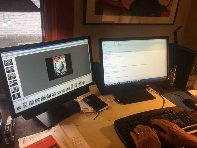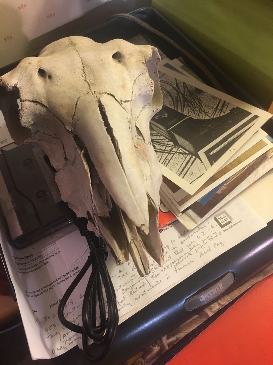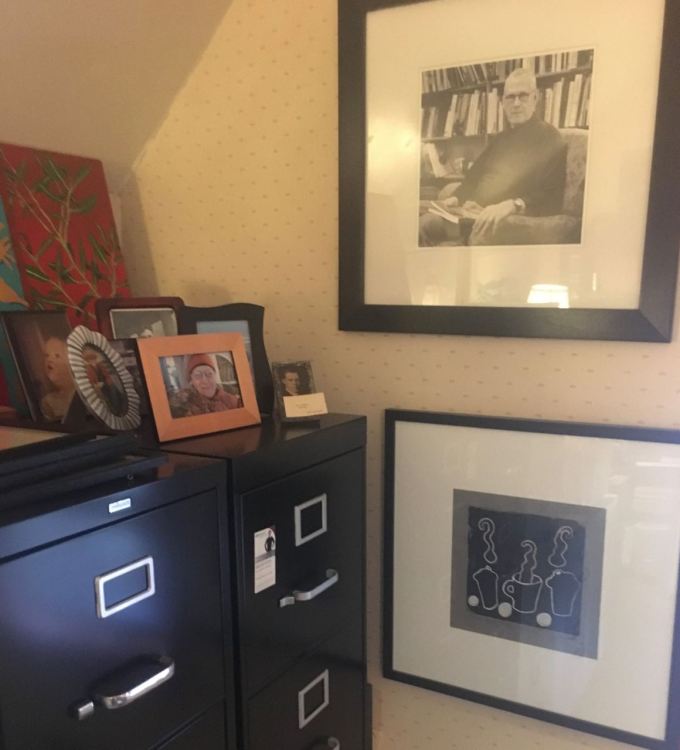Roger Hull is currently writing about Portland painter Lucinda Parker to go along with an exhibition at the Hallie Ford Museum of Art in the winter of 2019 (January through March). But here in the summer of 2017 the work is well underway. Usually he writes upstairs…amid files and ephemera and work made by former students of yore….