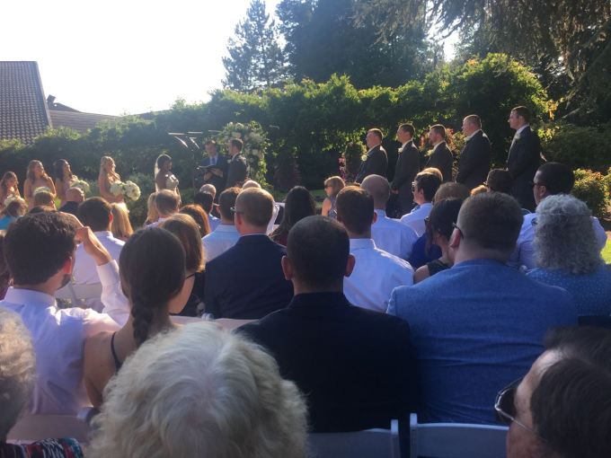 Which we did, so off to the wedding. Meg, the daughter of R’s cousin Mary, was marrying Bryan and it was a lovely event with lots of time to catch up with family…however, the chairs were all in the blazing sun except for one little corner that George staked out for us so we sat in the back row…