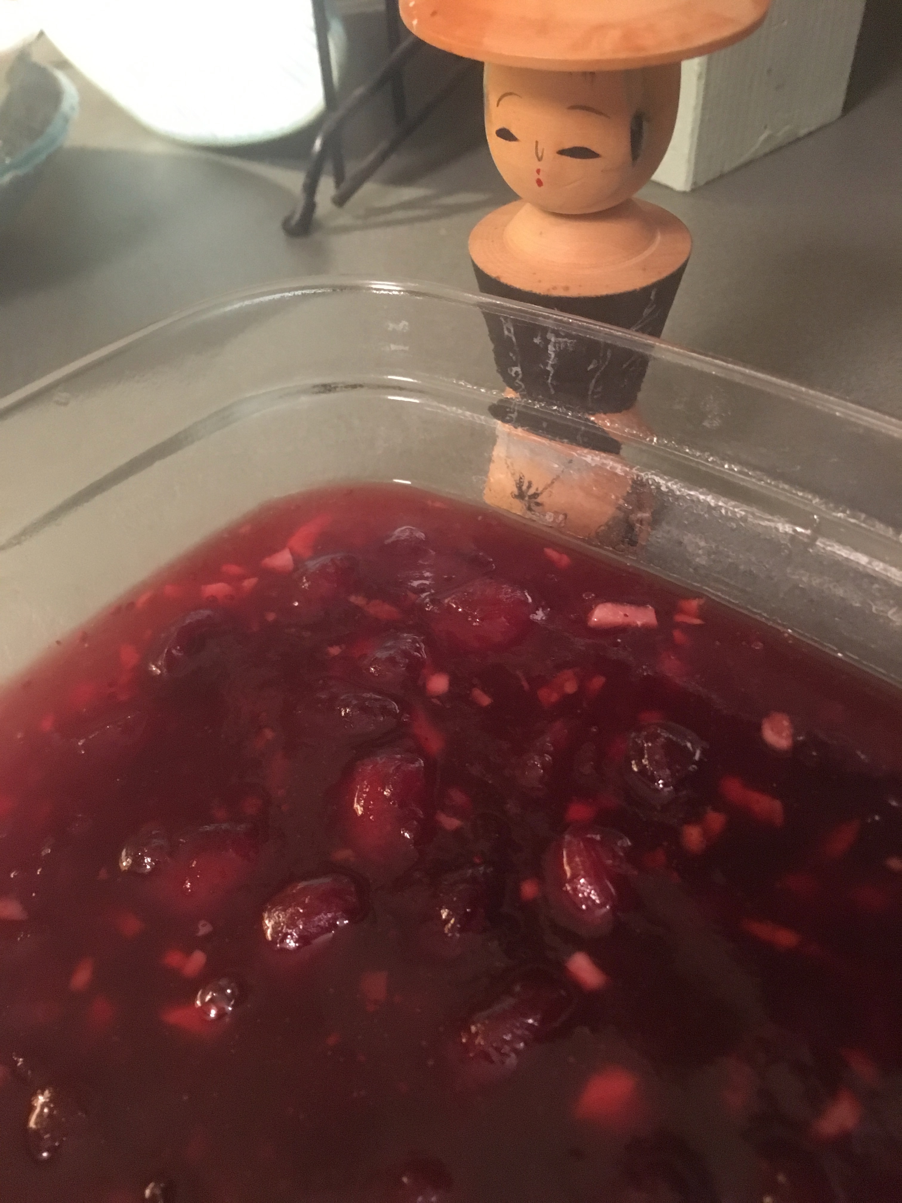 Some years ago now my brother Bruce got two recipes from NPR for cranberry sauce.  That was his “specialty”…and though we haven’t shared Thanksgiving with them in quite a few years, this Garlicky Cranberry Chutney is a mainstay…this is Susan Stamberg’s favorite she says…originally from Madhur Jaffrey’s cookbook “East/West Menus for Family and Friends (Harper & Row, 1987)…I made it last night and it’s ready to go.  No kidding, this stuff is soooo good and so easy.