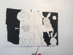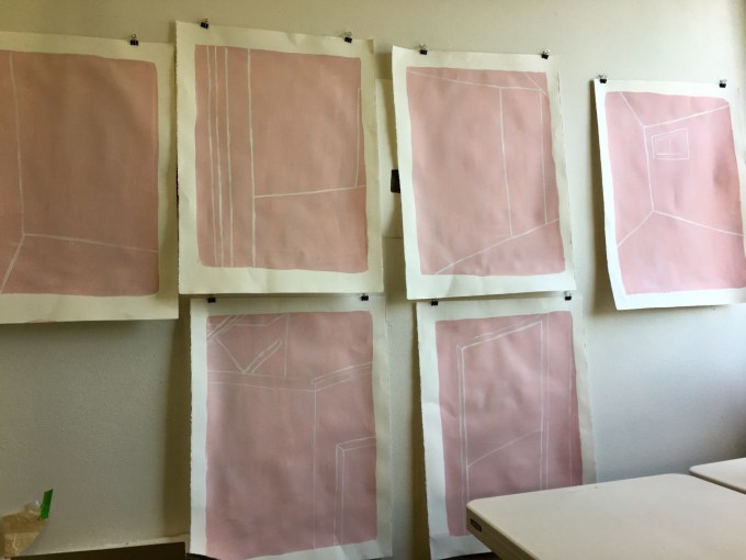 We wanted to do a collaborative thing…separate but equal…so we mixed up a big vat of pink gesso and each gessoed six big pieces of paper.