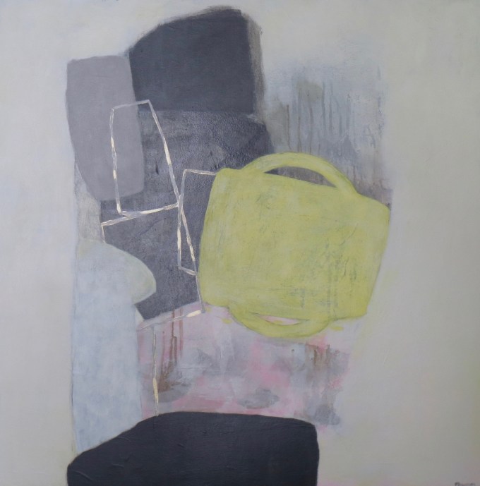 and so on.  When we had the final “reveal” while putting them up, we really laughed at some similarities…one of our studio-mates, the much-loved Rollie Wisbrock, died in the summer and we both included Rollie’s turquoise studio door in a painting…me (and additionally we had a bee infestation at home):