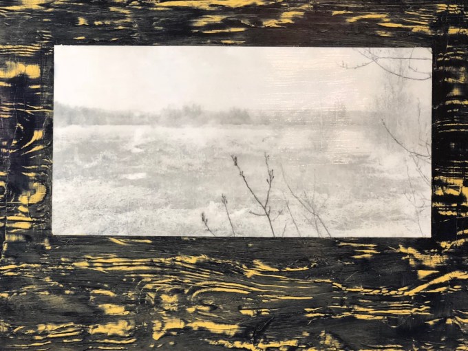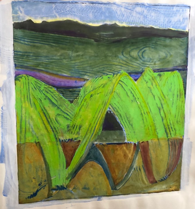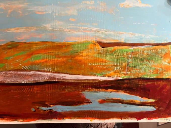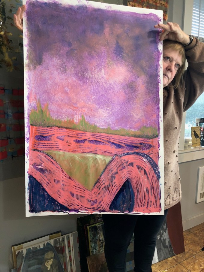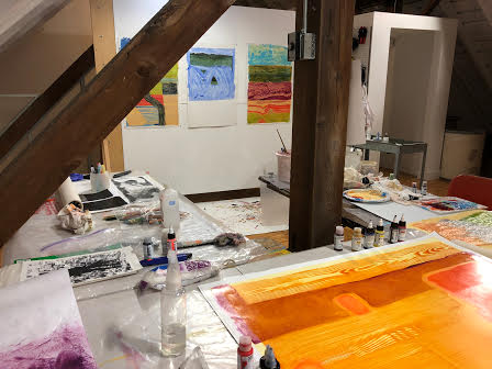 Corrie Loomis Dietz has worked hard at her job as a rep for Golden Acrylic Paint, and at her studio practice. She was a photographer, has done work with photo transfer and portraits, and lots of experimental work with paint, with her work moving more toward abstraction the last few years. She understands community and frequently brings artists together (“Drink and Draw”) in her studio. At long last, in November of 2017 after twenty years with Golden, she was offered a two week residency near Golden’s plant and offices in upstate New York. Recently Elizabeth and I visited Corrie in her Salem studio to see the body of work she made while in residence…and it’s very nice work.