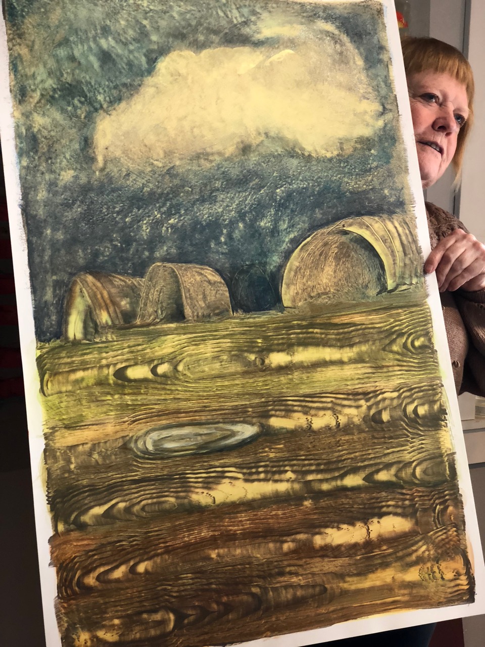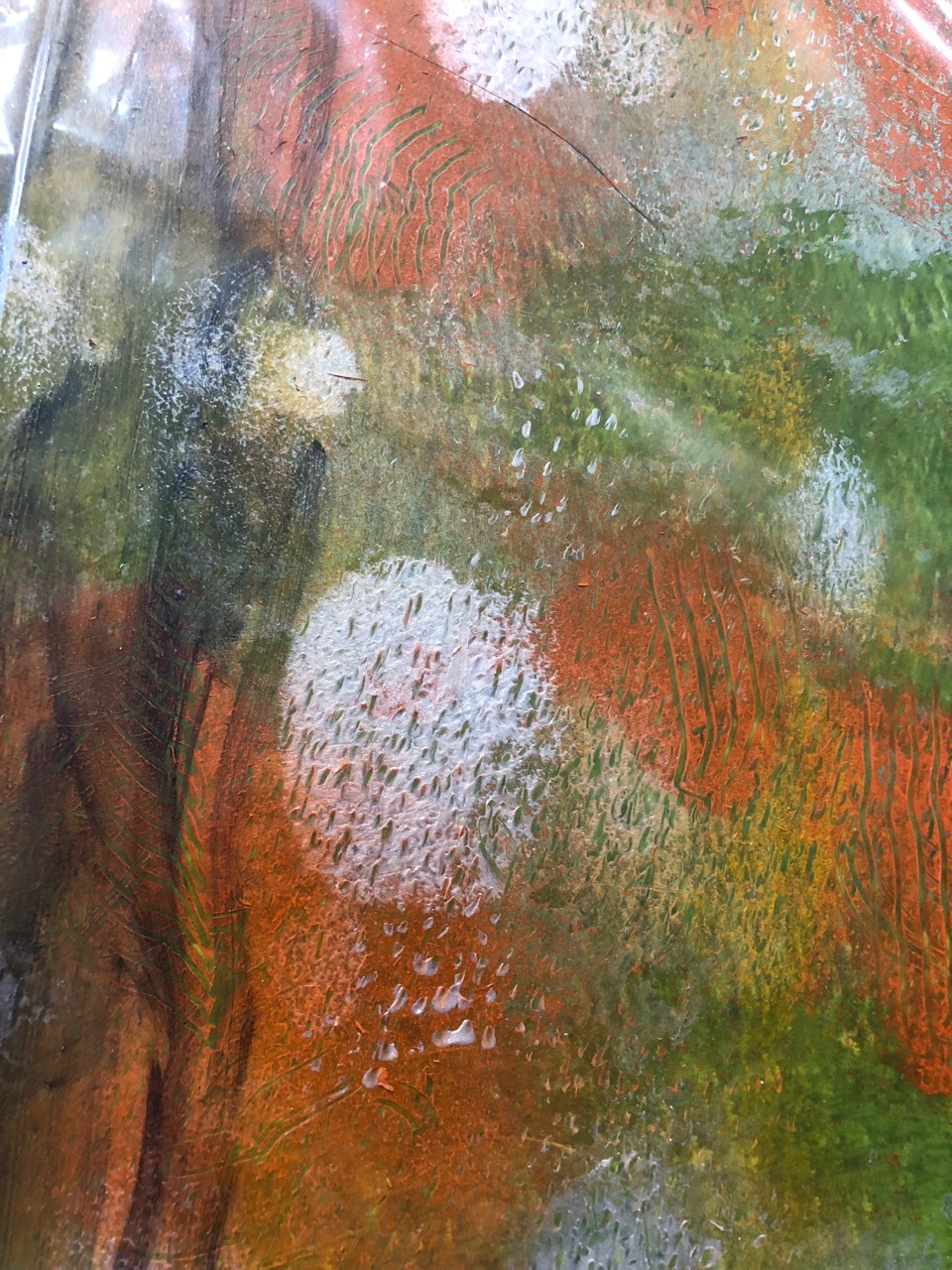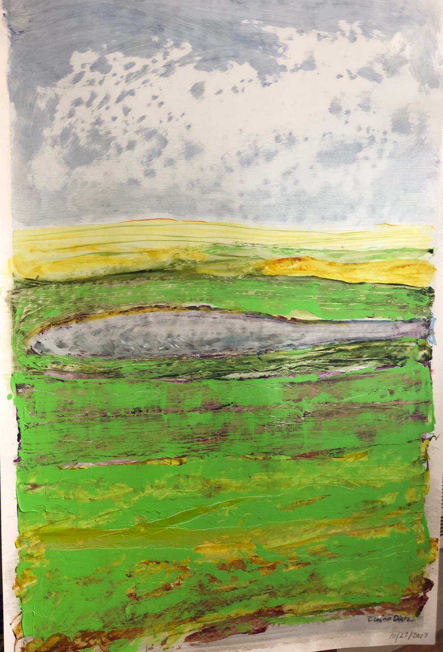 Corrie Loomis Dietz has worked hard at her job as a rep for Golden Acrylic Paint, and at her studio practice. She was a photographer, has done work with photo transfer and portraits, and lots of experimental work with paint, with her work moving more toward abstraction the last few years. She understands community and frequently brings artists together (“Drink and Draw”) in her studio. At long last, in November of 2017 after twenty years with Golden, she was offered a two week residency near Golden’s plant and offices in upstate New York. Recently Elizabeth and I visited Corrie in her Salem studio to see the body of work she made while in residence…and it’s very nice work.