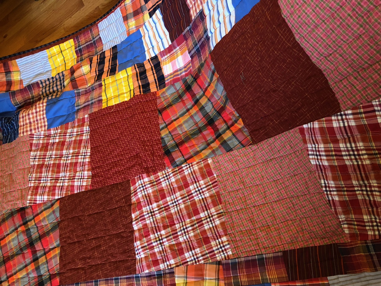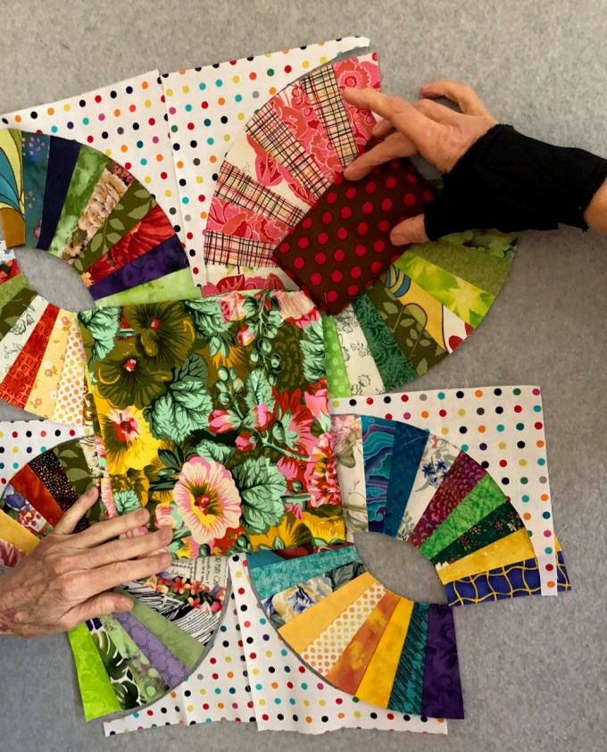 Supporting us in all these endeavors were my brother Bruce and sister-in-law LeeAnn who made beautiful meals, provided comfy (quilt-filled) accommodations, and snacks for a particularly LONGGGG afternoon, and then listened to the feedback at the end of each day…which added a lovely dimension to a fascinating adventure.  R lunched with the gallerists on Friday to talk nuts and bolts (paragraphs and commas??) and I got to go to “Rebels” (LeeAnn’s fabled quilt group) at Sally’s (Sally also known as master quilter Dorothy Le Boeuf).  Over these year’s of quilting I have learned a lot from both LA and Sally, so this was fun.  Oh, and the perfect breakfast with a view into the ravine…