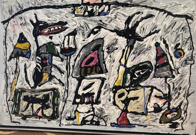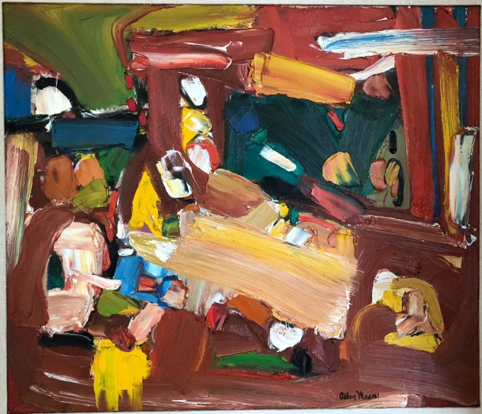 When then headed over to the studio of painter Gene Gentry McMahon who was a student, a colleague and a friend (and not a romantic one!)  She has a ton of work going on too, and a beautiful studio but the first thing R saw was…this painting he had been hunting for which was in the “Northwest Art Today” show at the Seattle World’s Fair in 1962…and then disappeared!