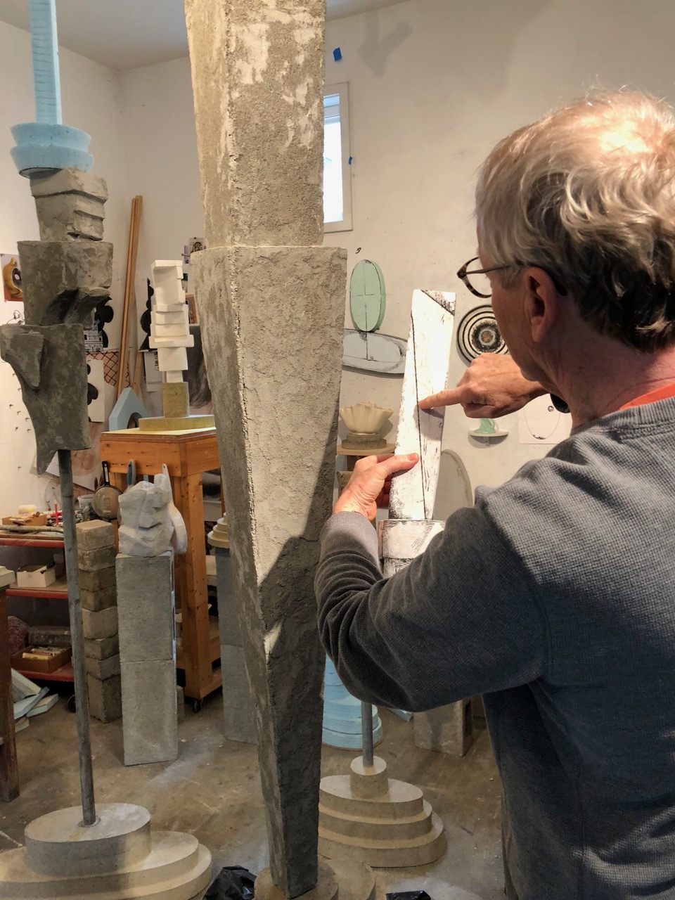 Originally a painter, McClelland is currently making sculptural work of an intriguing type with a Styrofoam armature covered with a stucco-like plaster which he carves into making marks…reminiscent of many buildings in Italy and elsewhere in Europe…