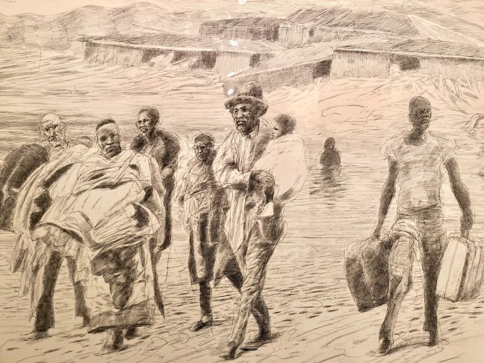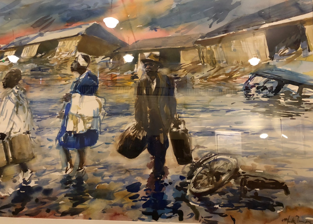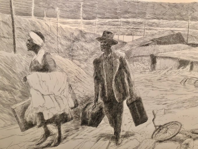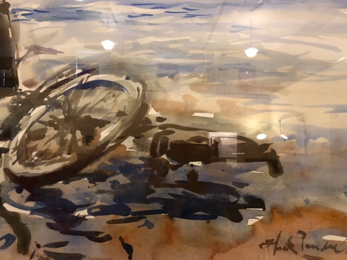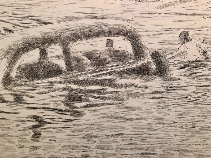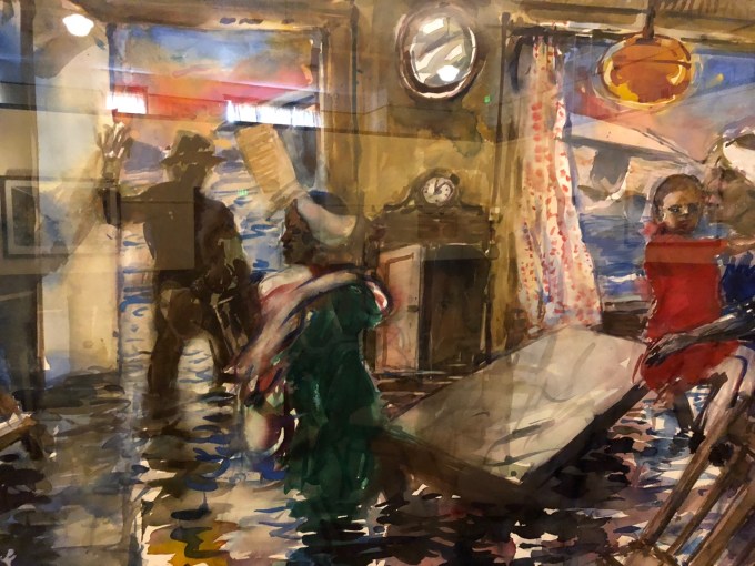 Somewhere in this process we got a call saying Sidney had been sent home from school with a fever and we weren’t needed, so we headed to Cerimon House to see Henk Pander’s tour de force series of work, both large drawings and full-size watercolors, about the Van Port flood which disastrously occurred in Portland Memorial Day week of 1948.  The beautiful works will be at Cerimon House (NE 23rd and Summer Street, 1 block north of Alberta) until May 27th (when we went nobody was there and we had to turn on the lights), and then at the White Stag Building from May 29-June 12th.  I really recommend finding these and taking a look.  As with all of Pander’s work they are dramatic, beautifully composed and strongly and meticulously executed, but the drawings were my favorites…