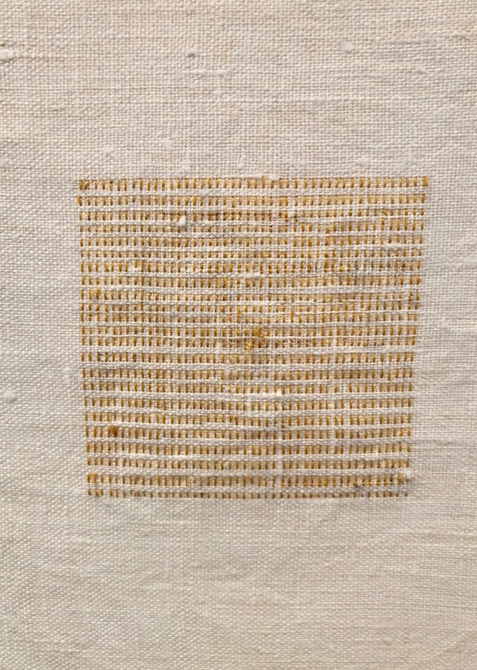 and then we popped into PDX Gallery to see the wonderful Heather Watkins embroidery pieces…work I really appreciate which started as a way to have something to do with hands, and ended being a very nice show with some 20 pieces on antique linen squares…some make you think you could almost read them…