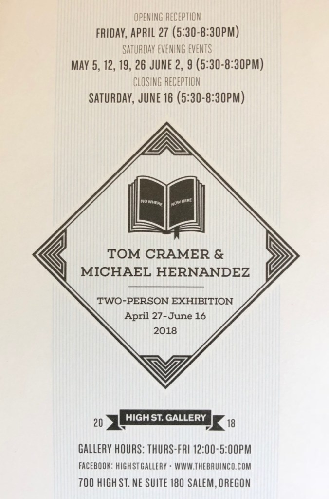 Salem is a tough place for art and artists. The favored price point is low (under $200, though there are many lovely houses locally filled with wonderful expensive work purchased in Portland.) The thing that made me an early supporter of the High Street Gallery was Hernandez’ support of local artists who almost never have a chance to show work here for lack of a venue, and the shows were wonderful. There are good artists here in Salem, making interesting work. The gallery existed because next door was the graphic design studio (The Bruin Co.) that Michael runs and which subsidized the gallery rent. Now as his business expands he needs a different office so…goodbye High Street Gallery;