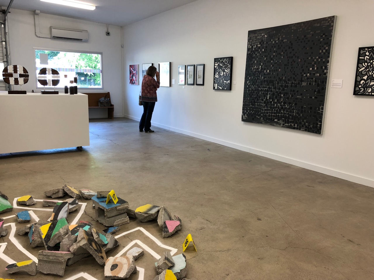 this is a very special post, bonnie. thank you for honoring the high street gallery and the part it played in this community. michael and angee are super special, and we will miss the saturday night gatherings in that wonderful space. we especially enjoyed your featuring michael’s work and in closeup. as to the pieces of the cramer mural you two chose, i’m only guessing of course, the flesh and white colored piece two up from the #6 since it has those charming “stitches” and maybe the one in the right knee, turquoise, black and pink, and the one that asks Y. at least those are the ones i favor. our 34th wedding anniversary coming up on the 17th and so we are going to have to miss this closing, alas, as we are taking a road trip to celebrate our years together. hope many folks will attend saturday the 16th to send michael off with all best for his new adventure.
