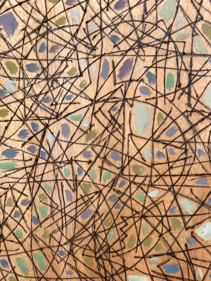 Tom Cramer has some smaller work combining wood-burning and oil paint on wooden panels…