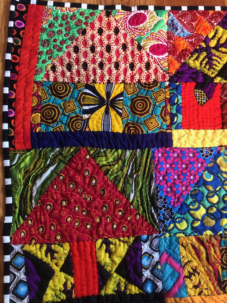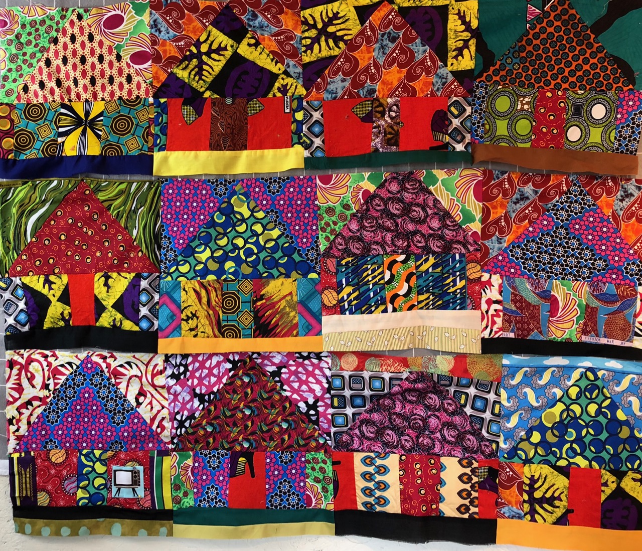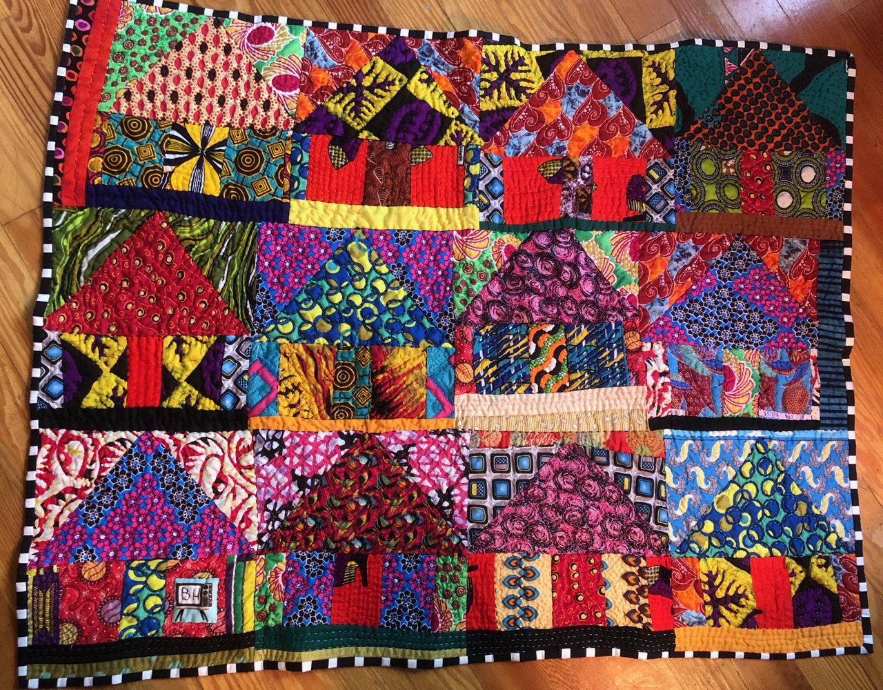 Jon’s real, and ongoing, project in the villages hes been drilling a fresh-water well, and fostering education. When he returned to the US this year he brought the two quilt tops Celestine had made, and the stack of hut-shaped squares. He enlisted his friend Carrie Brown to help him find somebody to quilt the tops, and I saw it on Facebook. The plea was for long arm quilters but I felt I would love to take on one of the quilts and quilt it by hand. Jon and Carrie kindly let me choose which I would take, and I took the squares. Carrie and Jon had floated the idea of sashing between each square, but when I got them on the design wall it was clear these all wanted to mashup together in a colorful “village” all their own…