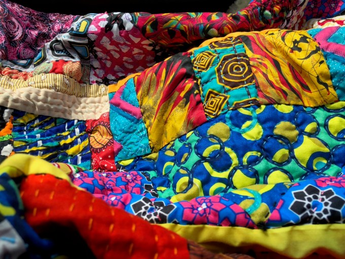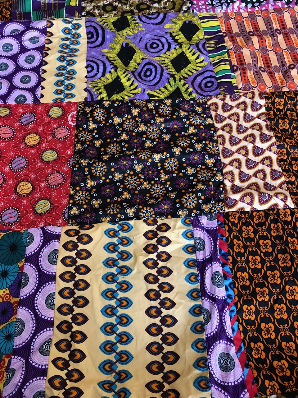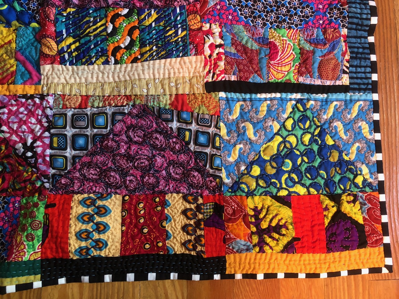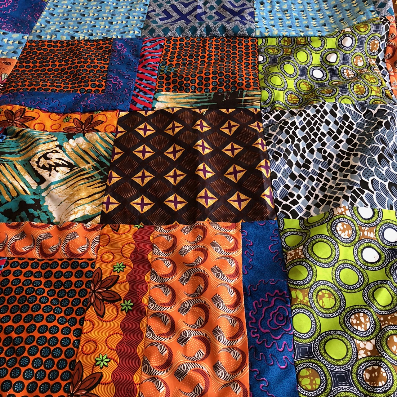 Jon’s real, and ongoing, project in the villages hes been drilling a fresh-water well, and fostering education. When he returned to the US this year he brought the two quilt tops Celestine had made, and the stack of hut-shaped squares. He enlisted his friend Carrie Brown to help him find somebody to quilt the tops, and I saw it on Facebook. The plea was for long arm quilters but I felt I would love to take on one of the quilts and quilt it by hand. Jon and Carrie kindly let me choose which I would take, and I took the squares. Carrie and Jon had floated the idea of sashing between each square, but when I got them on the design wall it was clear these all wanted to mashup together in a colorful “village” all their own…