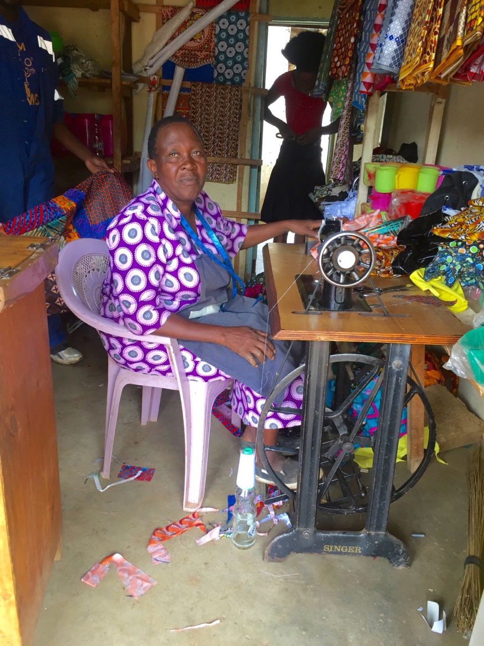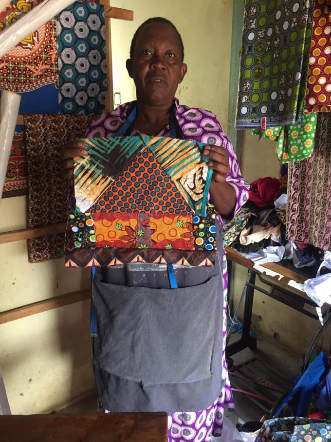 He met a young man named Demo from the village of Mahero in western Kenya, and his family. Demo’s mother is called Celestine Anyango Ogesa. Celestine supported her seven children and paid for their school fees by sewing in her one room tailor shop, providing the family’s only tangible income. They have a couple of small fields (maize and beans) a few chickens, and four cows. Celestine walks each morning at dawn to the fields, carrying her “jambe” (an African hoe) to weed the fields, then home and walks a mile to her tailor shop for the day. She is 70. She buys most of her fabric from Uganda as it cheaper there, and the selection is better. Celestine does her sewing on a treadle Singer machine…