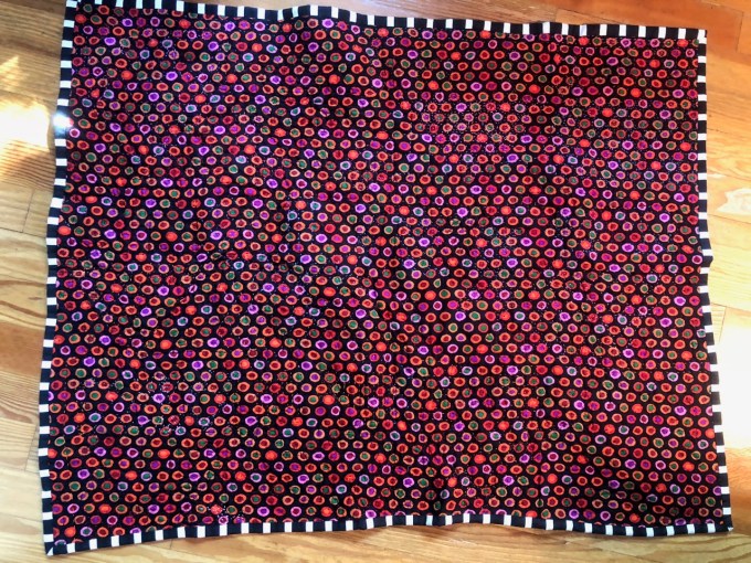 All summer long I’ve been working on a vibrant quilt. It’s not of my making but I’ve had the great good fortune to be part of the process, and my work on this quilt has given me a hopeful feeling about the creative work of the world and people of goodwill. Here it is, just about finished. I’ve hand quilted it and sometime next year it will be auctioned off for an excellent charity….but here’s the story: