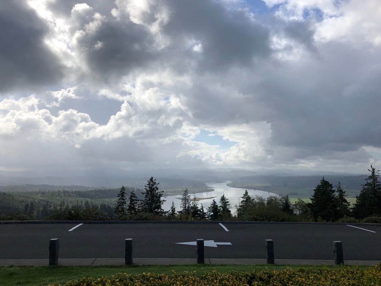 but even if you don’t climb to the top, the view is magnificent…here looking north the Meglar Bridge (opened in 1966 across the Columbia River and the longest continuous truss bridge in North America) takes you across to Washington State (where all the clouds are)…