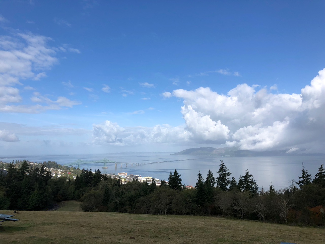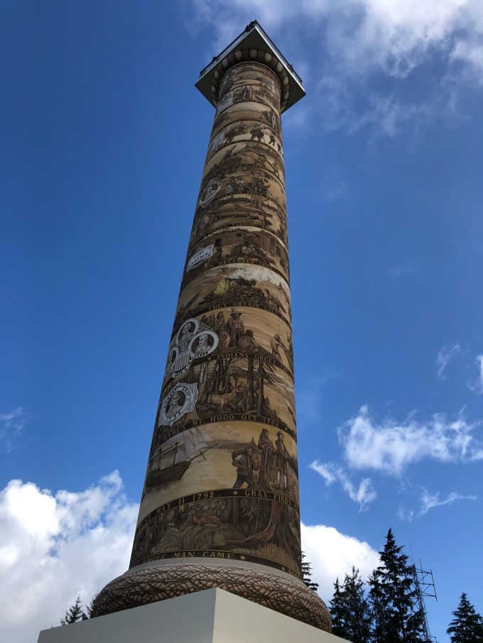 before we headed off to find the Astoria Column. If you have somehow missed this iconic Oregon spot, put it on your to-see list. The 125 foot column built in 1926 is fashioned after Trajan’s column in Rome (98 feet, 107-113 AD) and the Vendome Column in Paris (137 feet, 1806-1810)…and you can climb some 160 steps to the top (the black figure on the top is Jon, working off his brownie)