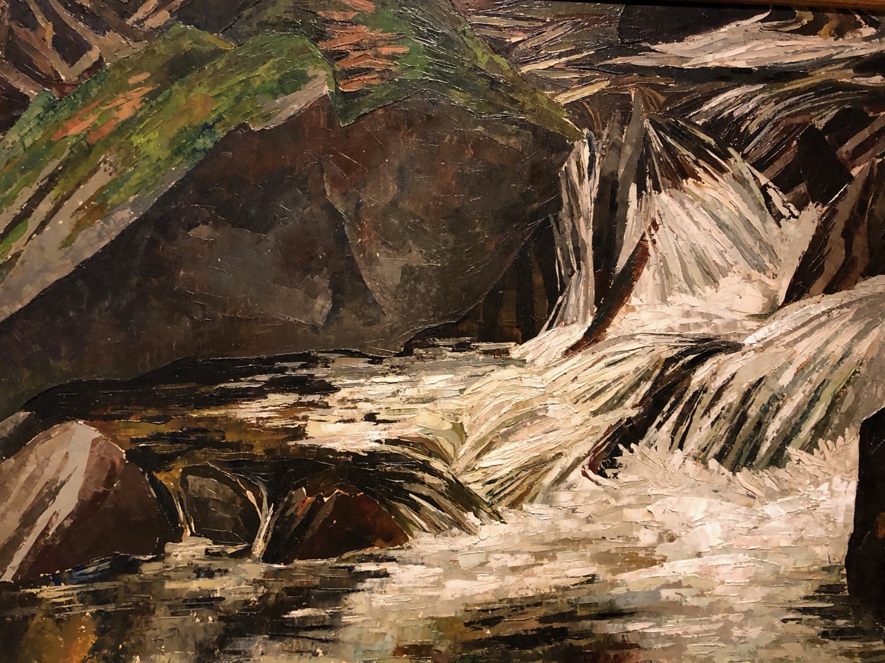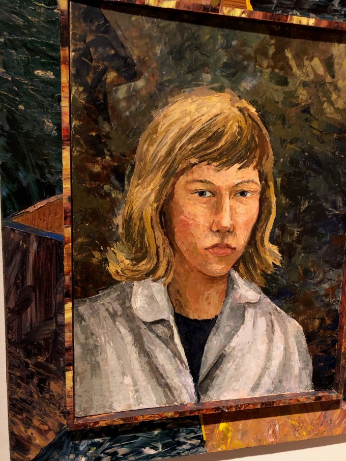The earliest work in the show is from Parker’s high school years including this self portrait, and a fully confident river painting foreshadowing later work…