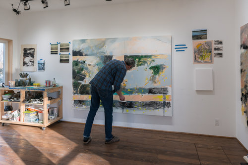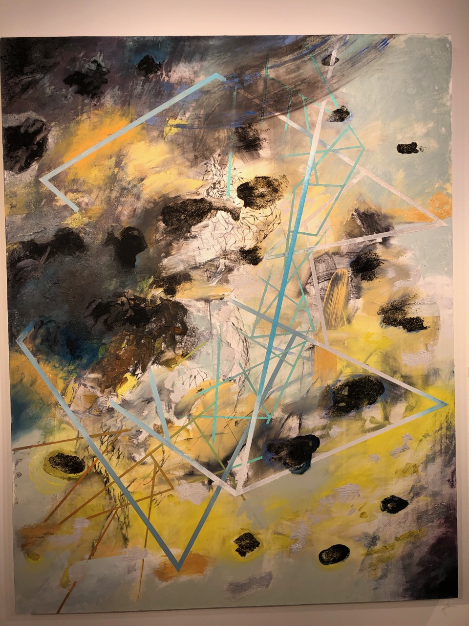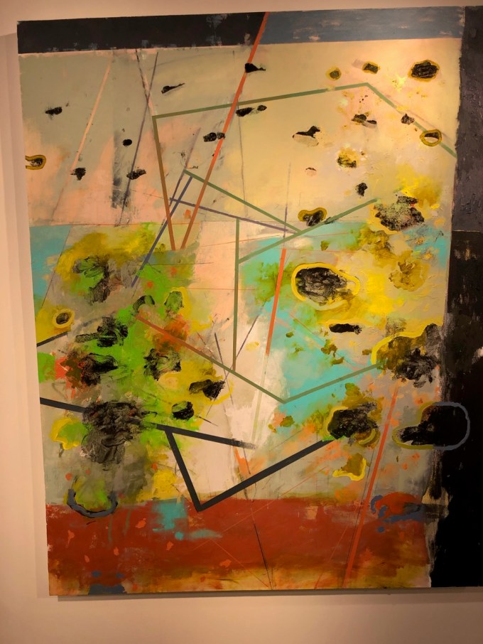 You still have 10 days to go see Seattle painter Kyle Cook’s show (https://www.pcc.edu/galleries/2019/01/14/events-excavations-constructions/) at the Helzer Gallery at Portland Community College Rock Creek Campus, gallery hours 9-5:30 M-F…up until February 22, 2019. The paintings are handsome with a map-like quality which hovers between landscape and abstraction. Bits of the road are embedded in the surfaces with rubber and reflective road paint which oddly adds to their delicacy. They’re big…Here’s “Estuary” from 2018