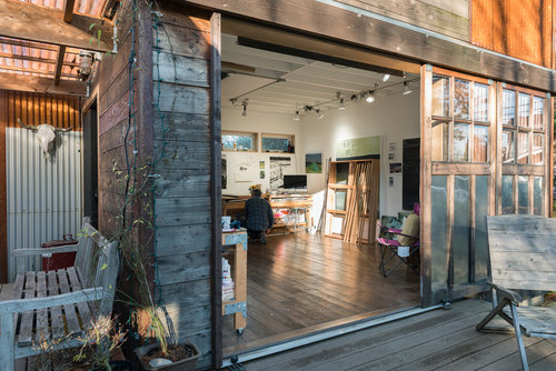 I met Kyle a few years ago when he and his wife painter Melissa Dold moved into a house across the street from my brother in Seattle. They were remodeling and adding a big new studio (each has their own level in the two-story structure) and had just put in this circular stair…the space was designed and built by Seattle firm Atelier Drome which not only has nice images of the studio on their website, but also images of Kyle at work on a piece from the Helzer Gallery show…