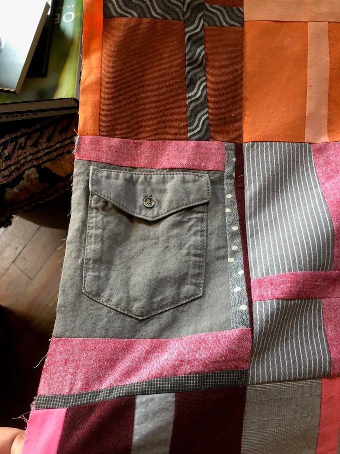 Bunny had a “snow day” off last week and instead of working remotely she sewed all day on this Jacquie Gering inspired quilt…all from shirts with one pair of pants and one skirt…