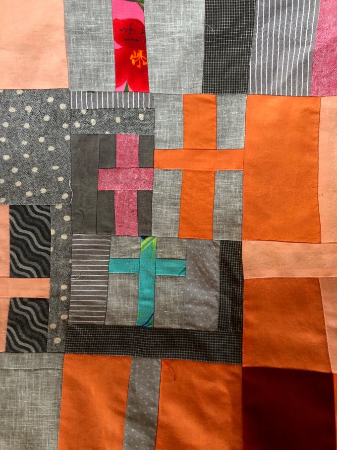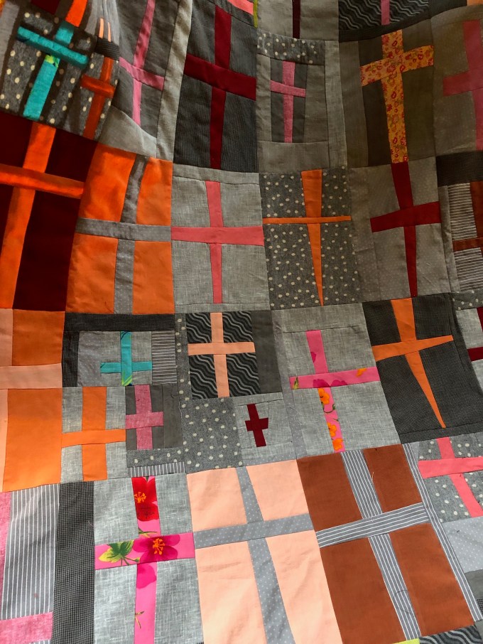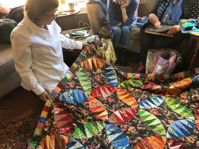 Meanwhile Kate brought the Kathy Doughty-inspired quilt that we all had “voted on” (the background anyway) last year…