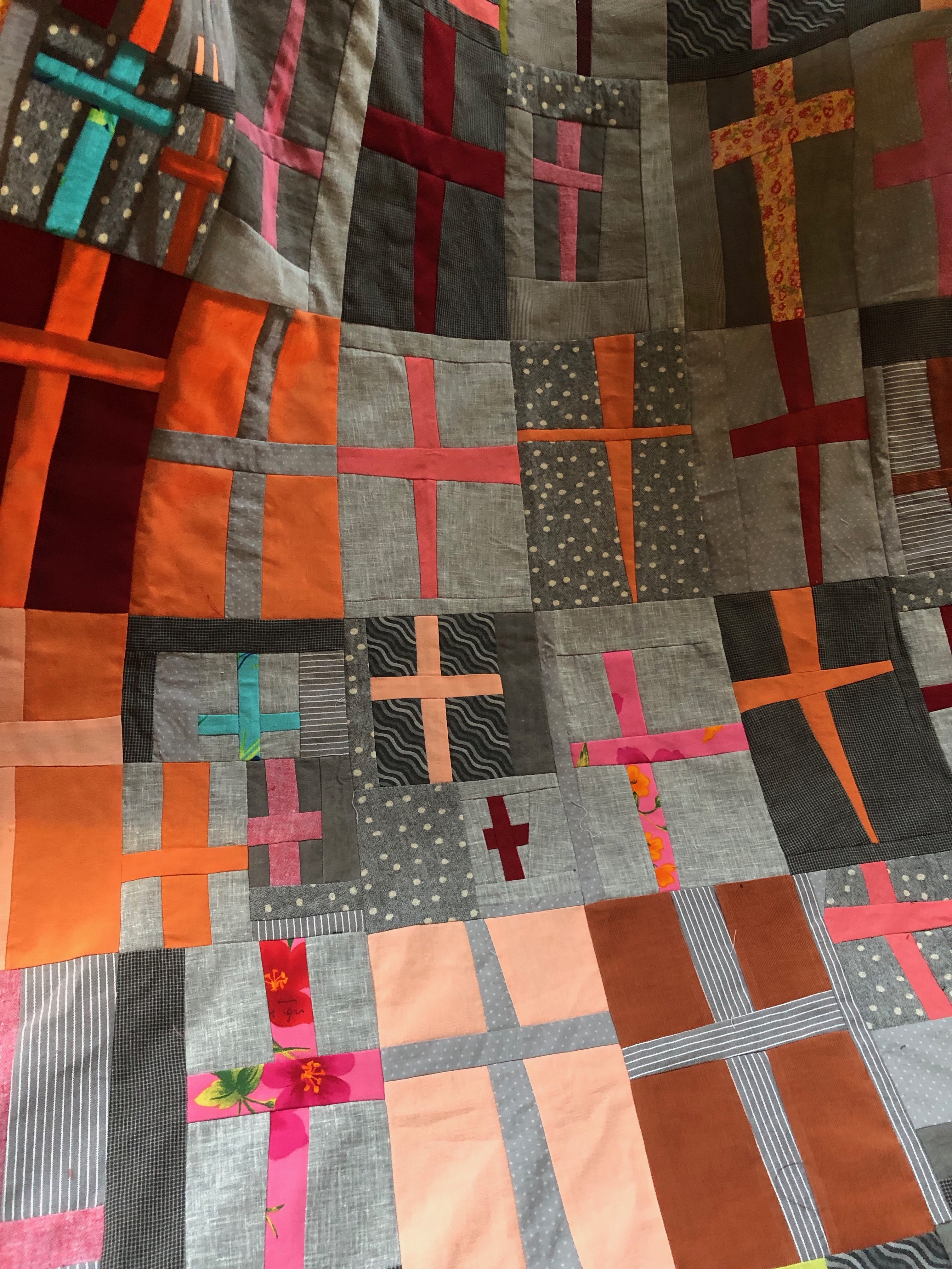 Meanwhile Kate brought the Kathy Doughty-inspired quilt that we all had “voted on” (the background anyway) last year…