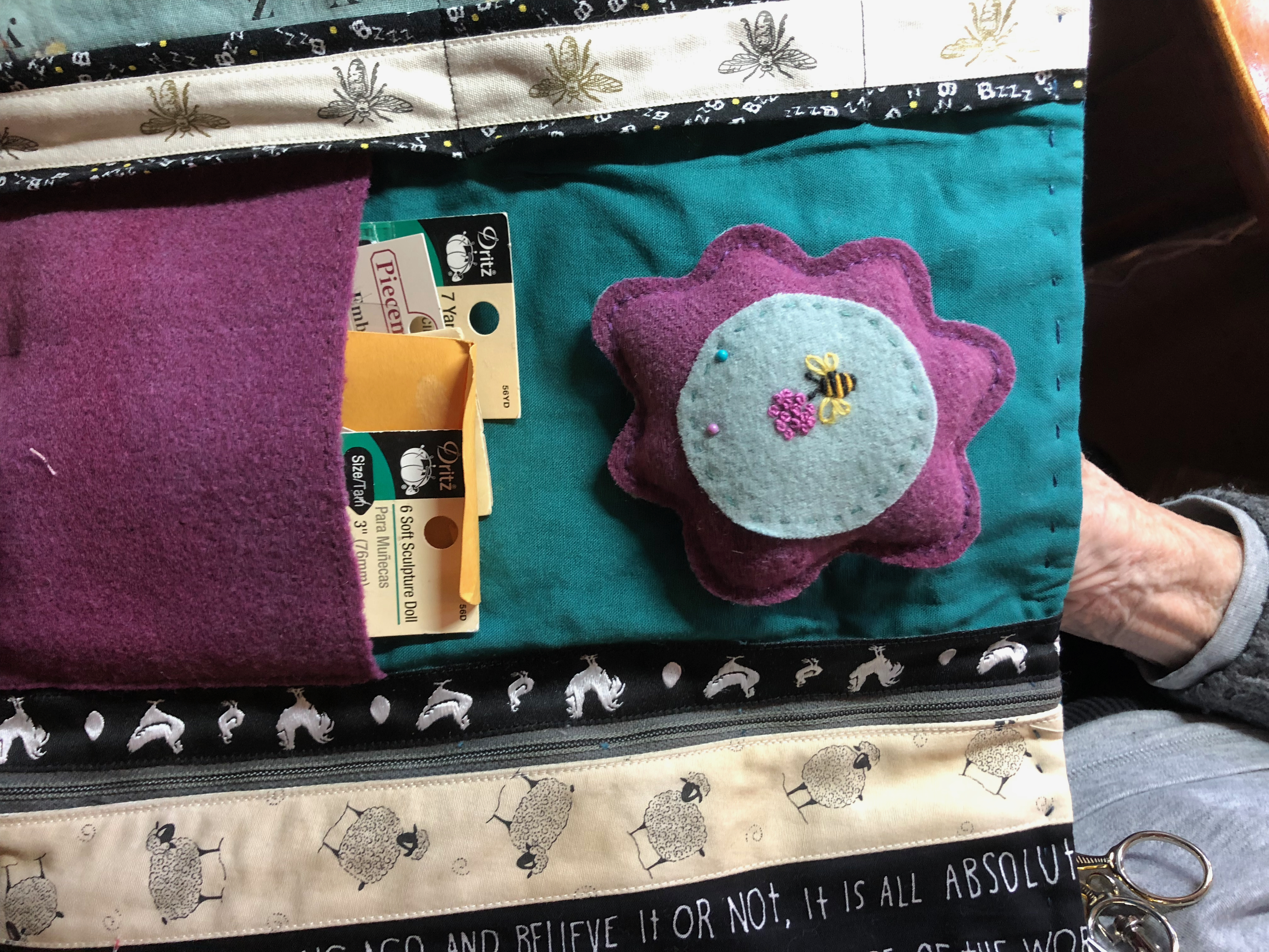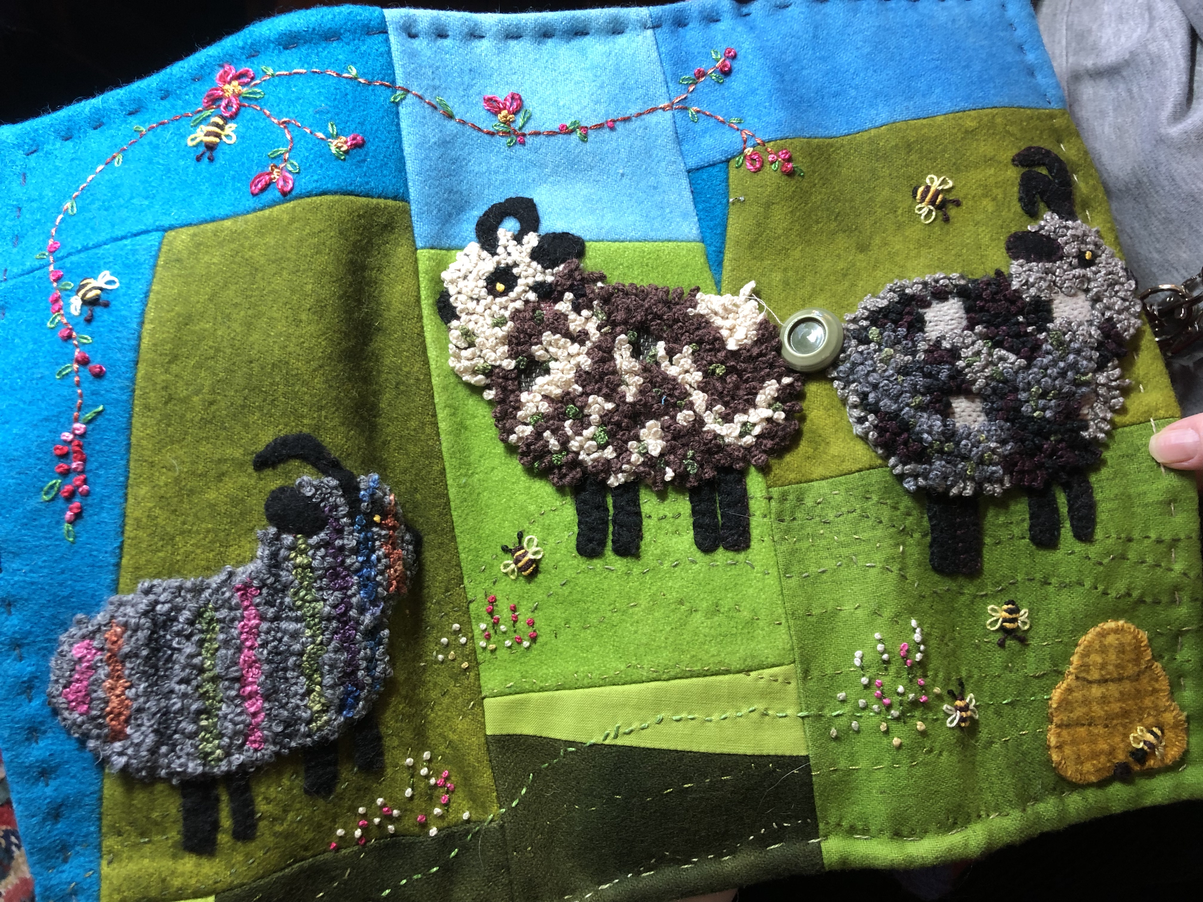 and Bunny added the sheep in “drizzle stitch”…Plus Bunny made this Sue Spargo-inspired needle case…