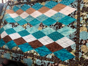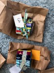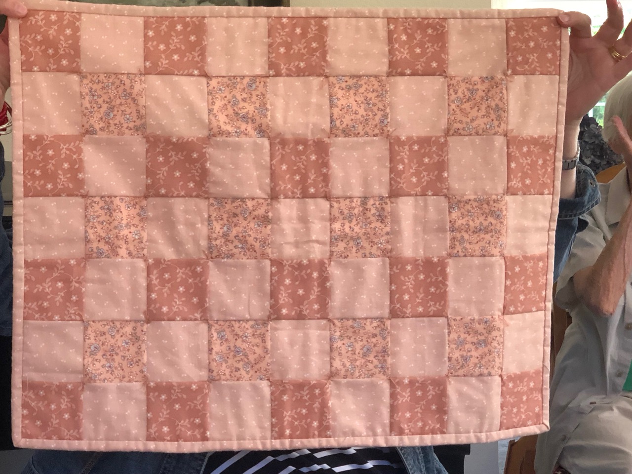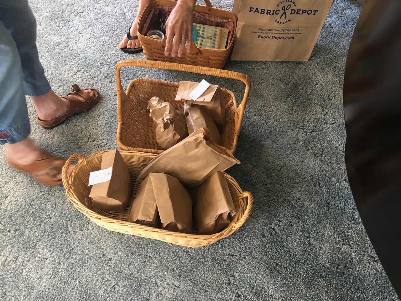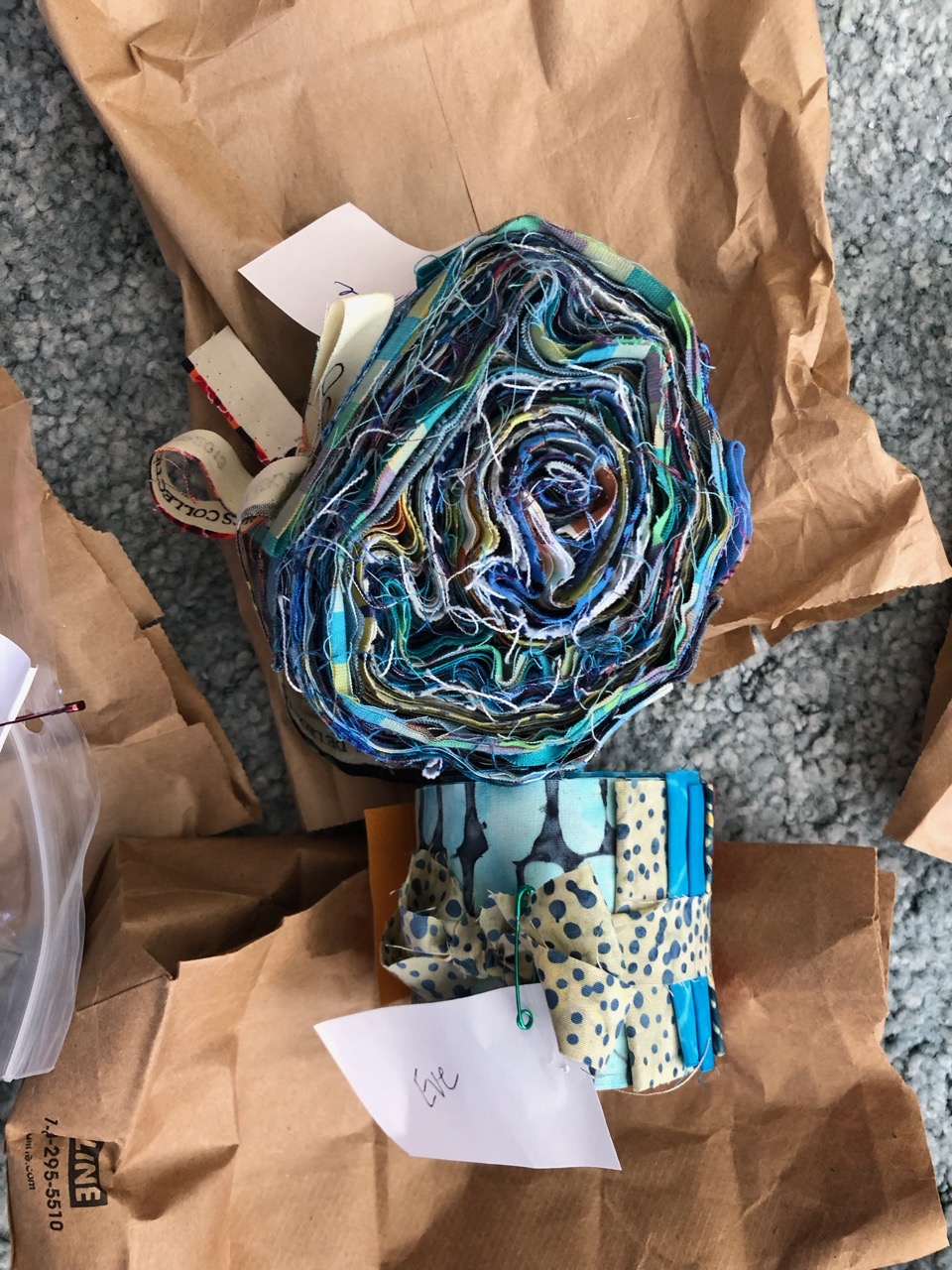 Each person came with a “jelly roll” of fabric…20 strips cut 2 1/2 ” wide. The rules are to use the strips to make a top, NO other fabric can be added, sew up the pieces into a top and in December each top will be returned to the fabric donor for quilting or finishing…so everybody got a brown paper bag for their jelly rolls on which their name was pinned ( for the return in December )…and then we each took a bag!