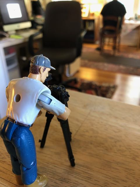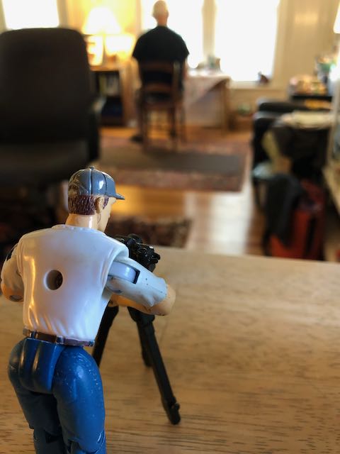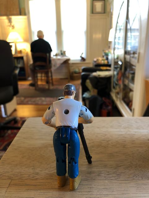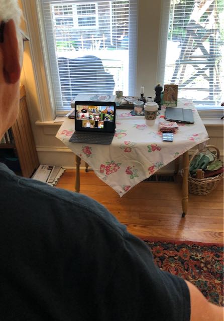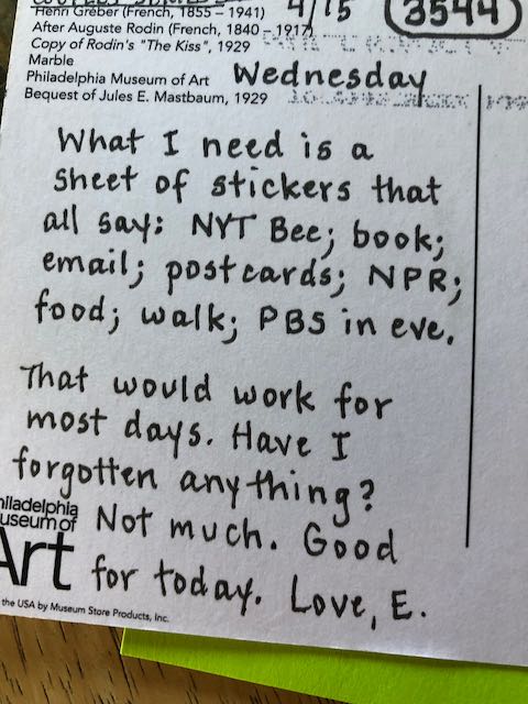Ellen lives in Vermont and writes a card everyday. Presumably she could just slap a sticker on a card and send it off…The number circled in the upper right is the card count, today 3544…10 years of cards and (of course) I have them all. (She doesn’t want them back…I think it’s a future gallery show called SNAIL BLOG. Someday.) My list would have weeding on it, otherwise life in Salem and life in Vermont are quite similar. Today began differently though as I made a drawing early, the BEE, and then Klaus was just determined to get a picture of R during ZOOM exercise…and Klaus can be very determined…