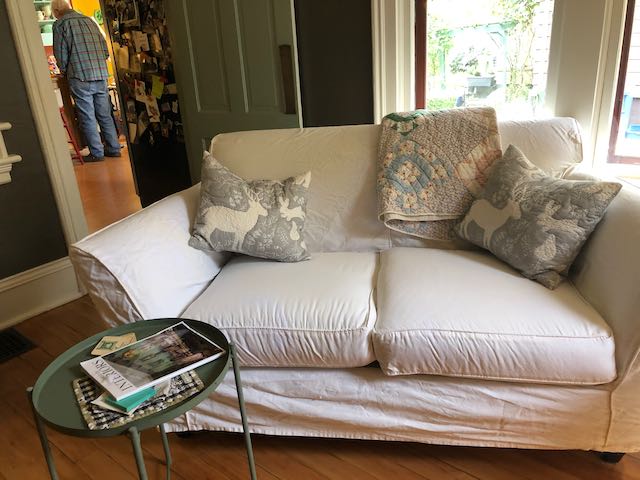 My almost-aerobic activity was getting the slip cover off the couch, washing it and (alas) wrestling it back on…(note the prep cook in the kitchen doing the dinner prep…).