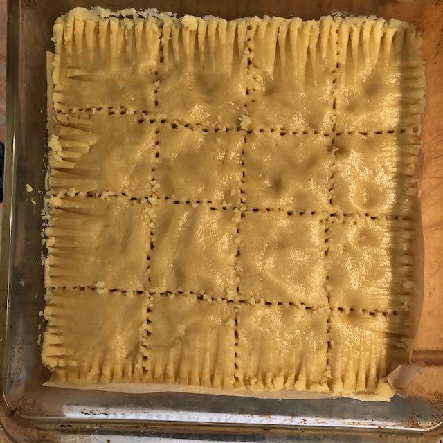 Using an 8 or 9 inch square pan lined with paper (no need to grease pan due to BUTTER!) press dough into pan.  (I like to use a fork around the edges and then use the tines to mark the pieces as it makes cutting easier later.)  Bake at 350 for 40 minutes.