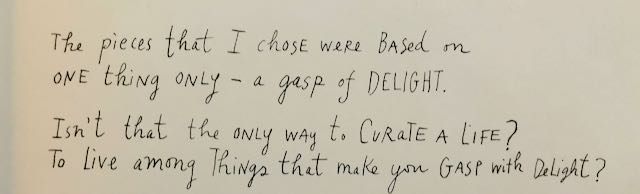I’m having a one-person Maira Kalman reading festival since I discovered Alibris as an antidote to Amazon. I don’t buy many books these days, but these books have such appeal for me…she’s an artist, writer, illustrator, wit. In 2011 Kalman was invited to curate an exhibition of her favorite things from the Cooper-Hewitt Museum collection in New York (imagine such a thing) and she took a year to examine the collection and choose. She then wrote and illustrated a lovely book about the experience, and about the act of curating itself…”My Favorite Things”…and how did she choose?
