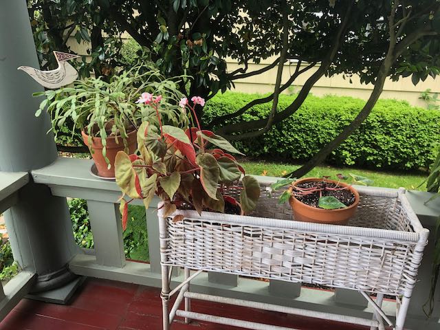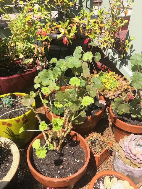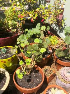 In the spirit of the times, and with the inability to go to a nursery, I’m devoting my plant-pot attention to the old plants, the plants R put in the basement for the winter…geraniums mostly, and a begonia. They were bone dry, full of cobwebs, spindly…but I brought them up, tidied and trimmed and repotted or refreshed the soil. They are happy already, even after just one day in the sunshine…we’ll just see how it goes. Yesterday he washed the porch and I brought up a rickety old wicker thing…