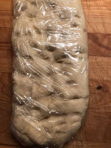 * Lay a 12 inch long piece of plastic wrap on a clean surface.  Work the dough into a rectangle on the plastic…about 8 ” long and 6″ wide.  Work the dough into a rectangle on the plastic (about 8″ long and 6″ wide).