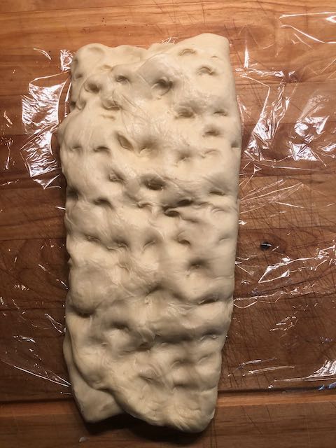 Press your fingers into the top of the dough all over (think focaccia).  Fold the left third over (think letter) and repeat indentations.  Fold the right third over and more indentations.  Cover with plastic wrap and let rise 20 minutes.