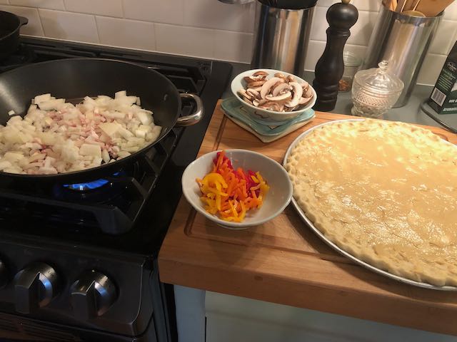 Pizza is really the perfect food for this moment.  You can use any old stuff moldering in the fridge… and make something delectable…BUT…you do need the perfect dough recipe.  Suzanne Lenzer at the NY Times comes through with what I think is the perfect perfect recipe.  It’s stupendously simple to make and the dough is lovely…the baked crust delectable.  It makes two big pizzas so I can make one for supper and put a ball of dough in the freezer…it freezes well.  It calls for a food processor, and I used one, but I think this dough could easily be made in just a bowl.