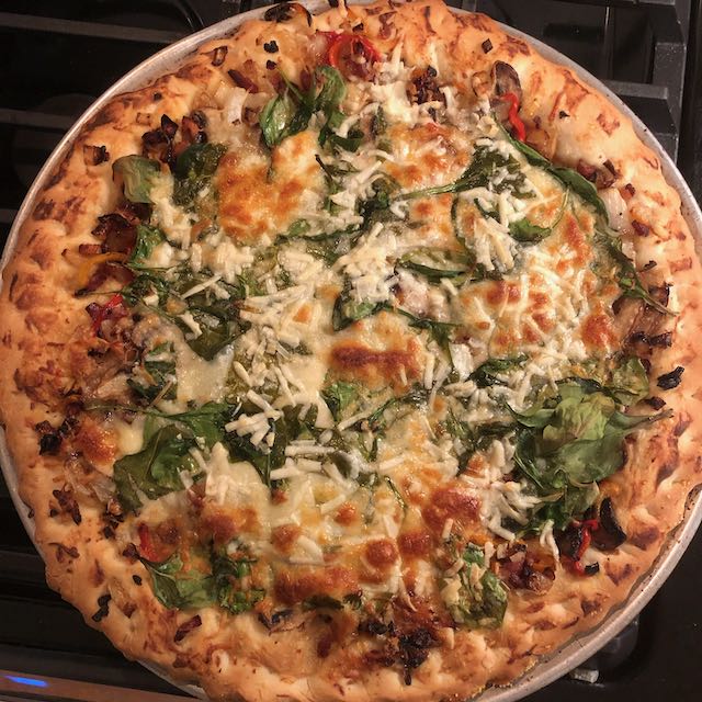 Topping: One time we wanted pizza and had no sauce so I spread dijon mustard over the pizza dough and sauteed onion, peppers, pancetta, mushroom or whatever less or more) and then combined some spinach and shredded cheese which cuts the cheese-load…our new favorite…the only one I make these days.