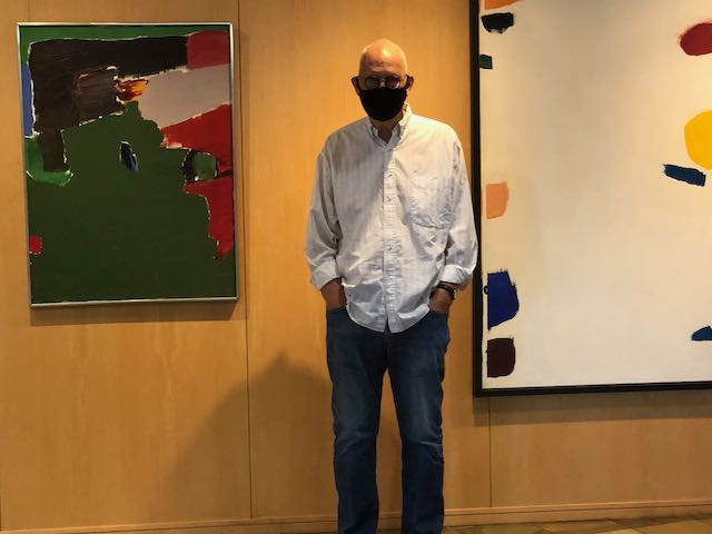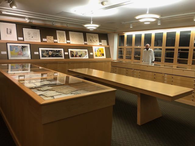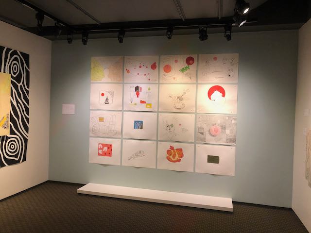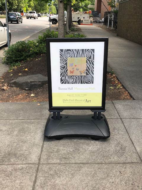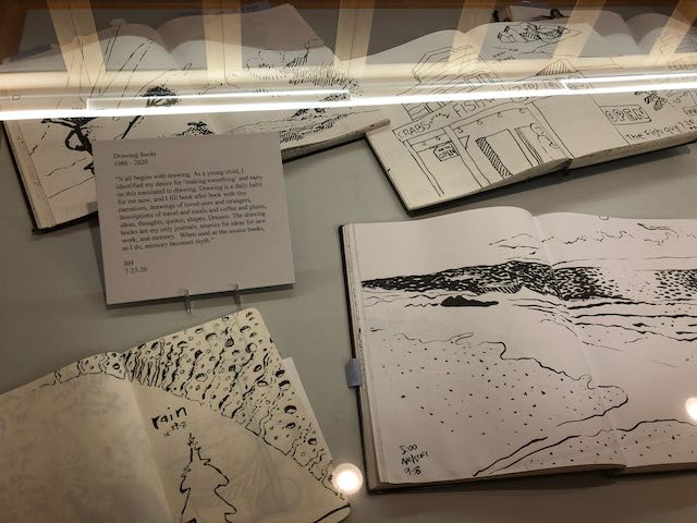 3. Bonnie, you should have seen our mouths drop open when we got to the “mask up” ending of this lovely document! Thanks for including us in this way. We are both very excited about seeing these two shows and will undoubtedly see them many times as there is a lot to take in. The back wall color in the study gallery really shows off the collected drawings and the white barrier plank on the floor is perfect with it. Your show is nicely hung. We also enjoyed the signage for your exhibition outside the museum. Dave figures that black structure holding it must get filled with water to add stability. Is so?
