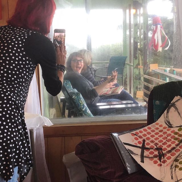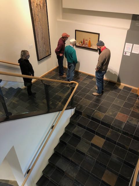 Gathering now seems like an unbelievable luxury. Hugging is a slim memory. Yesterday a small gathering was had when George and Aaron and Jackie met us at the Hallie Ford Museum of Art to see the Clifford Gleason exhibition (Clifford Gleason: The Power of Paint) and my exhibition (“Bonnie Hull: Memory as Myth”)…masked and distant …except for the brief moment when Jackie Johnson removed her mask for a quick photo in front of her own painting now on view in the Carl Hall Gallery in the museum, generously purchased and donated by June Brothers.