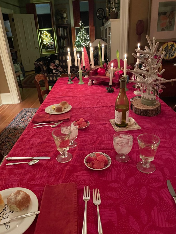 I cleared my art supplies and gift wrap off the table and set it up for dinner for two (even though it can and has seated 12)…