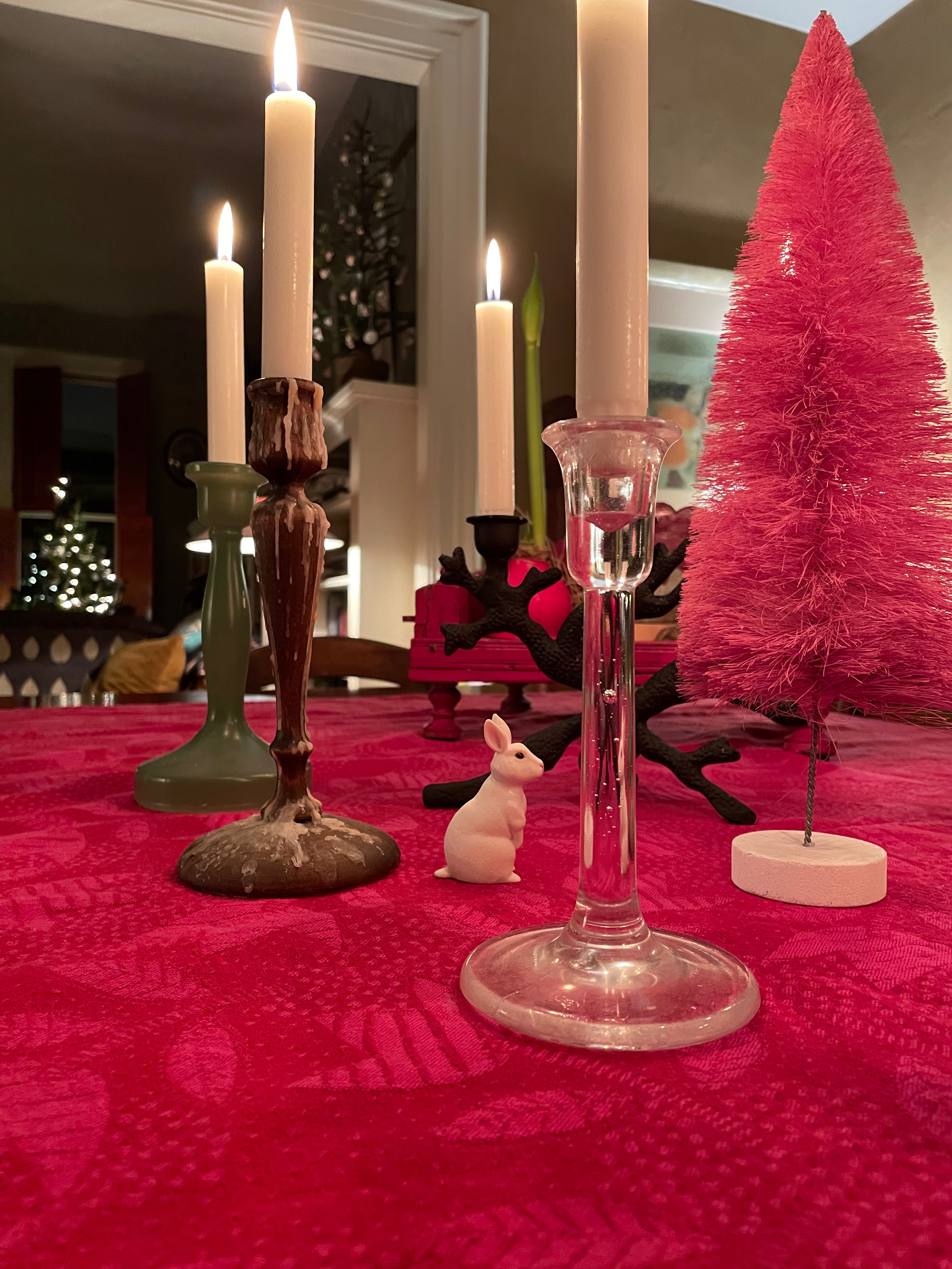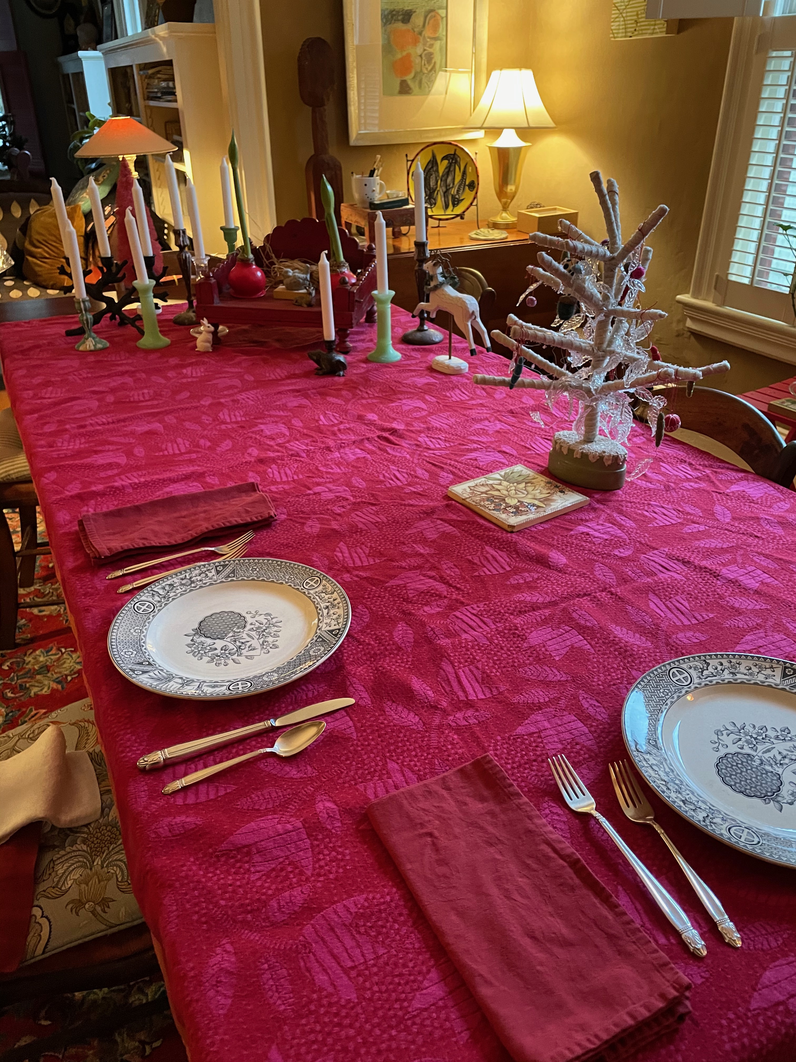 I cleared my art supplies and gift wrap off the table and set it up for dinner for two (even though it can and has seated 12)…