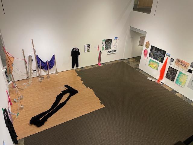 This exhibit included two performances seen on line of “Our Bodies Know the Way” with senior art major Cal Lawton https://www.youtube.com/watch?v=-wakN_8HPgg and lots of mixed media pieces including drawings and mixed media fabric pieces. Here’s Cayla engaging with a wonderful installation by senior art major Brooke Bailey…