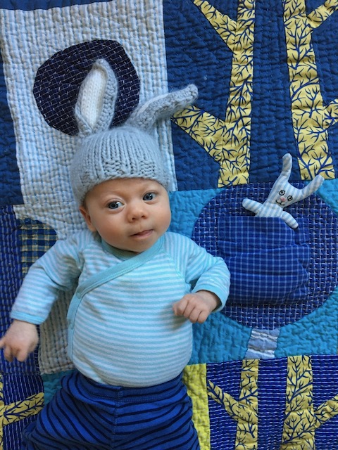 (My first visit to Skillin-Brauchle’s studio was in 2019 to deliver a quilt for the coming explosion in her personal life, and here is Nico on that quilt!)