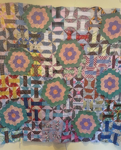 6. Bonnie, I really dig so many things about the quilt you posted in this “On The Way”. The 7 (viewable) “flower shapes”, for lack of a better name for them, add a consistent colorway for a quilt pieced with various patterned and plain scraps of cloth. And it’s the piecing and placing of similar fabrics, red & white stripes, brown with polka dots, pillow ticking, ditsy florals, etc., that seems so masterful and hypnotizing. I grew up with a handmade quilt from my grandmother made from her own and my mothers’ old dresses and aprons. I never tired of running my eyes over the various fabrics and they were placed much more random, crazy quilted, than yours, which are placed with an artist’s eye, much as in a painting. A beautiful piece of work!